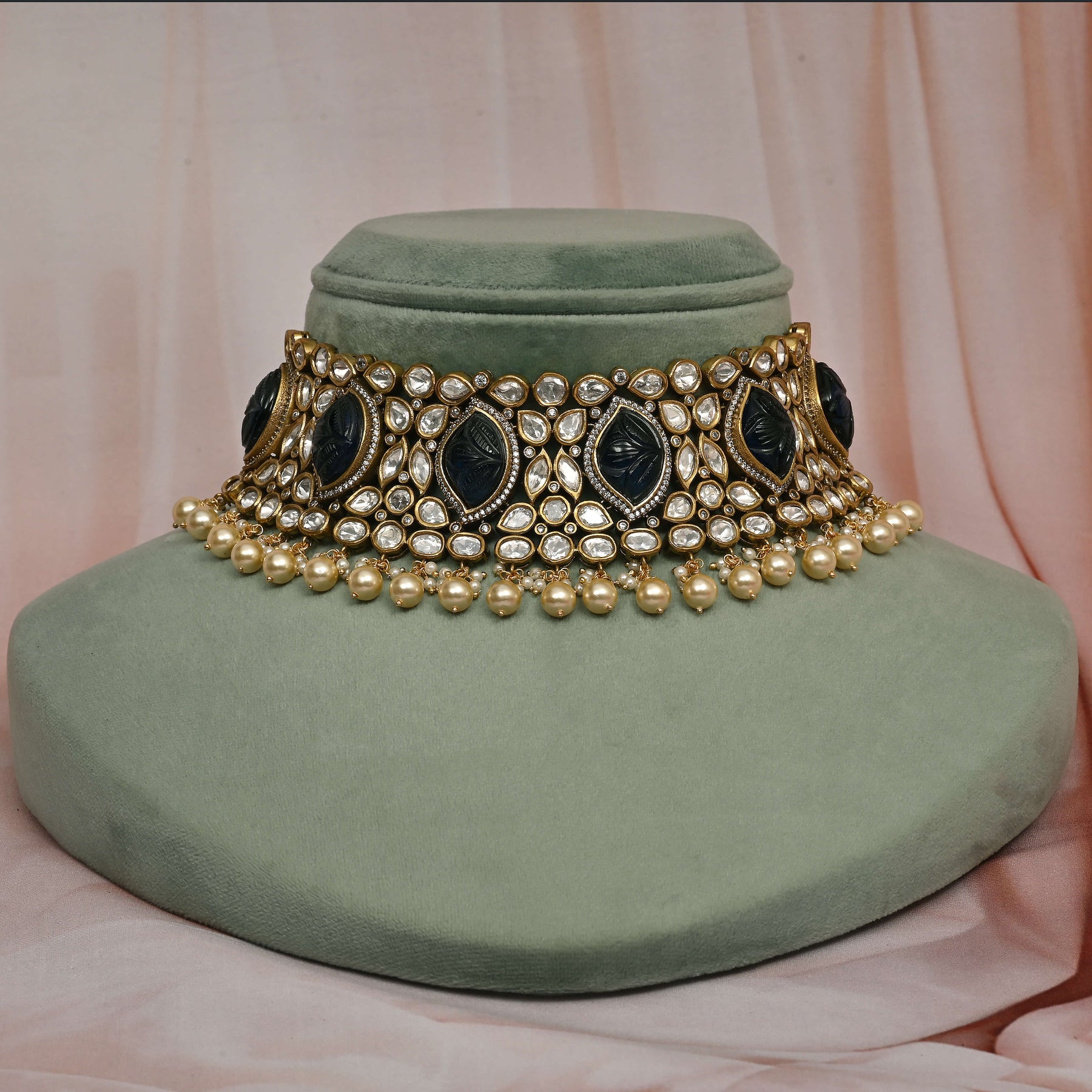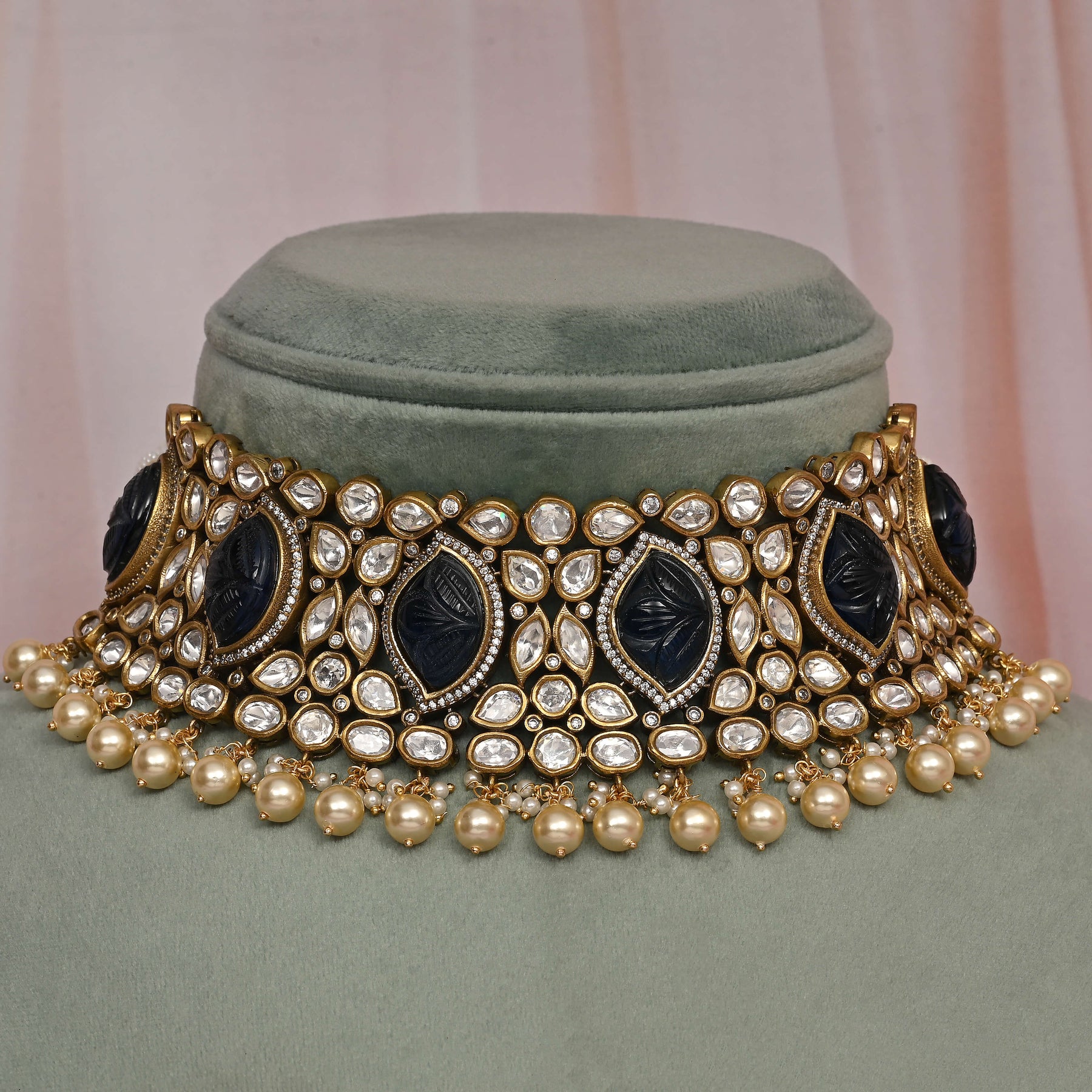 This Victorian choker set showcases expert craftsmanship with a unique, one-of-a-kind design. Featuring real cubic zirconia and moissanite stones, it offers the brilliance and sparkle of genuine diamonds. Delicate pearls dangle gracefully, enhancing its timeless elegance. Handcrafted to perfection, this set combines classic Victorian style with exceptional quality for a stunning statement piece.