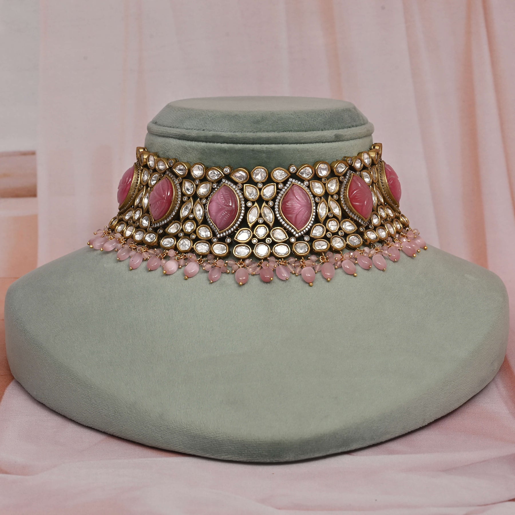 This Victorian choker set showcases exquisite craftsmanship with a unique, one-of-a-kind design. Featuring real CZ and moissanite stones, it offers the brilliance and sparkle of genuine diamonds. Delicate pearls dangle gracefully, adding timeless elegance. Handcrafted to perfection, this set combines classic Victorian charm with modern sophistication, making it a standout piece for any special occasion.
