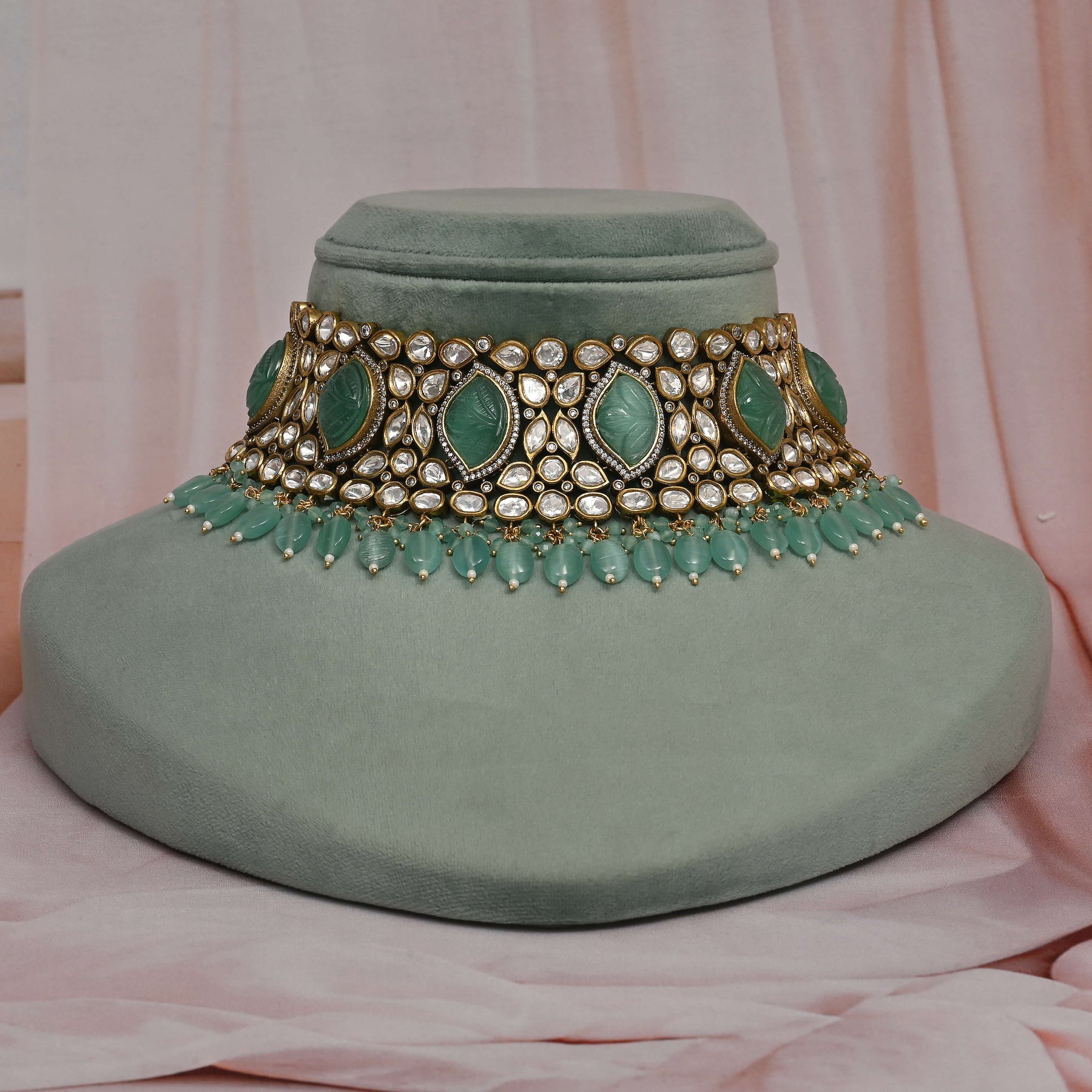 This Victorian choker set showcases expert craftsmanship with its unique, one-of-a-kind design. Featuring real CZ and moissanite stones, it offers the brilliance and sparkle of genuine diamonds. Delicately accented with dangling pearls, this handcrafted piece combines timeless elegance with exceptional detail, making it a distinguished addition to any fine jewelry collection.