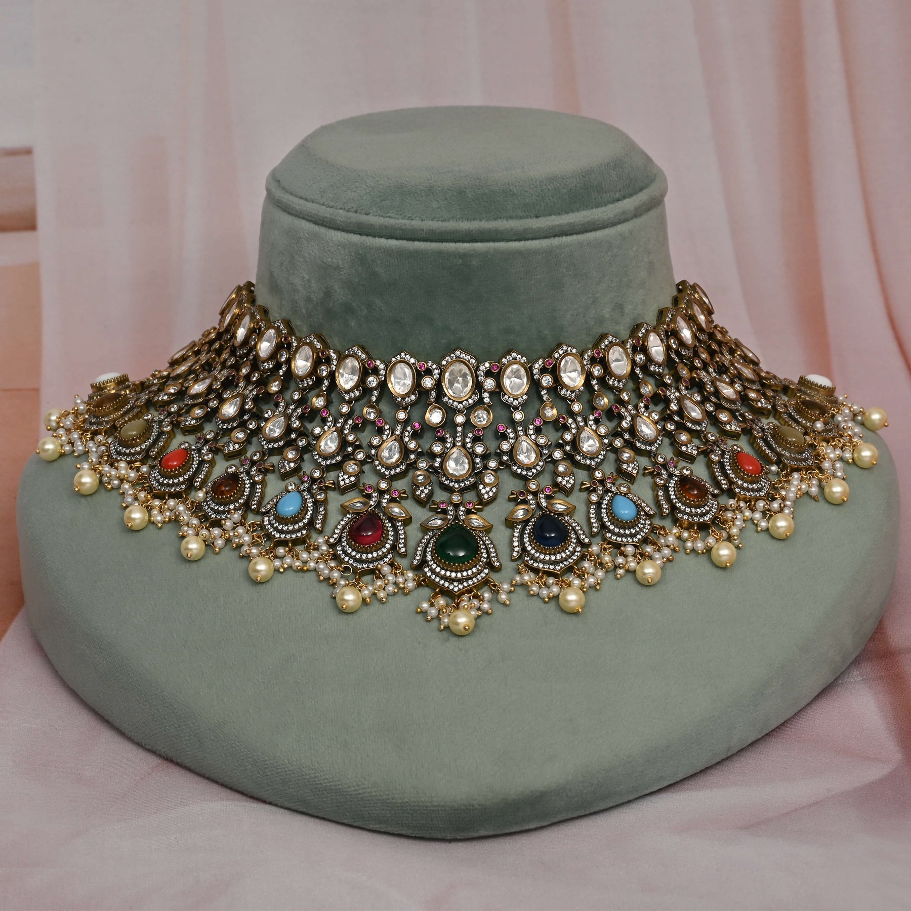 This Victorian choker set showcases expert craftsmanship with its unique, one-of-a-kind design. Featuring real CZ and moissanite stones, it offers the brilliance and sparkle of genuine diamonds. Delicately accented with dangling pearls, this handcrafted piece combines timeless elegance with exceptional detail, making it a distinguished addition to any fine jewelry collection.