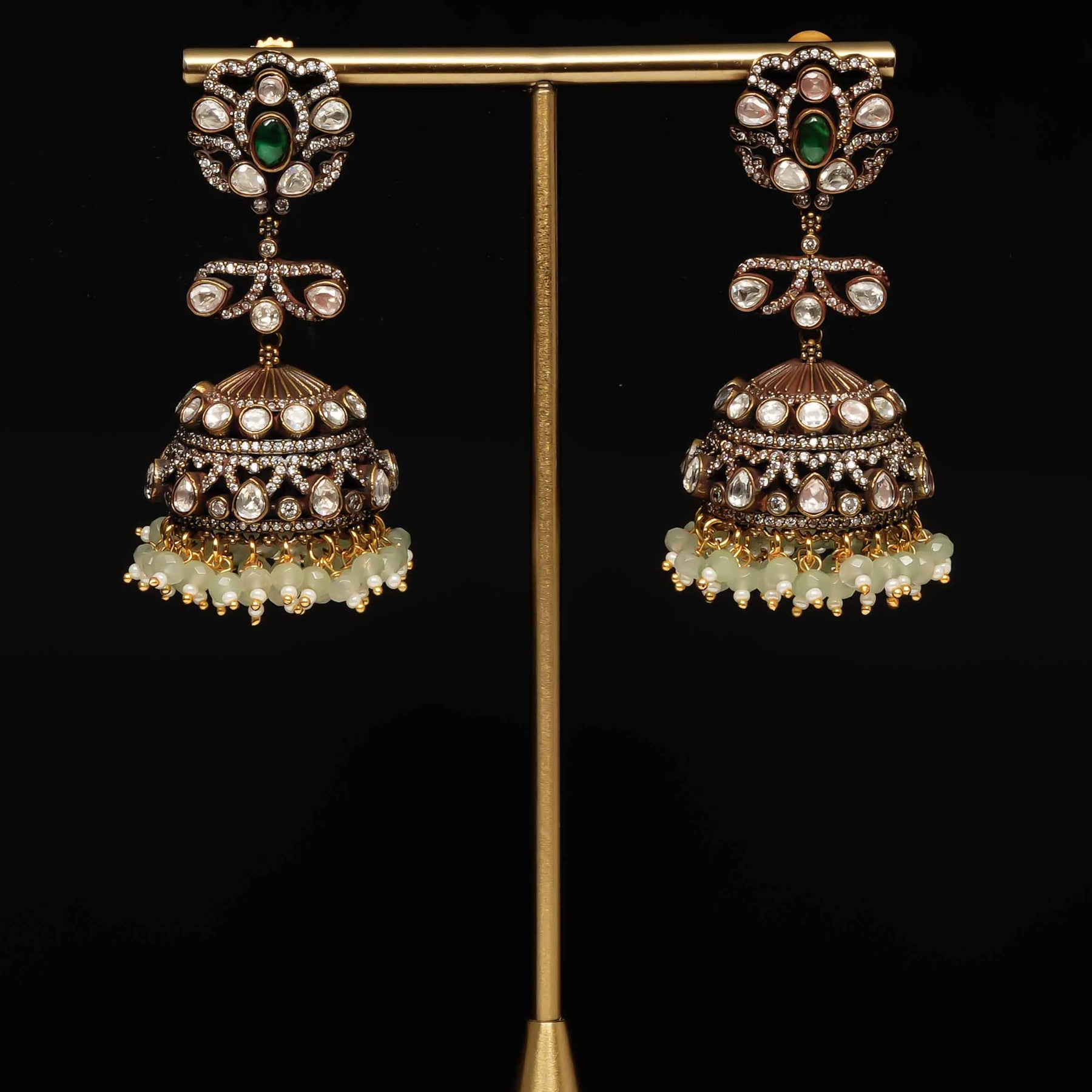 These Victorian Jhumka Earrings showcase exquisite craftsmanship with delicate pearls gracefully dangling, enhancing their timeless appeal. Handcrafted with precision, they feature moissanite stones that mimic the brilliance of real precious gems, offering a unique and elegant design. Perfect for those seeking a one-of-a-kind accessory that blends classic Victorian charm with modern sophistication.