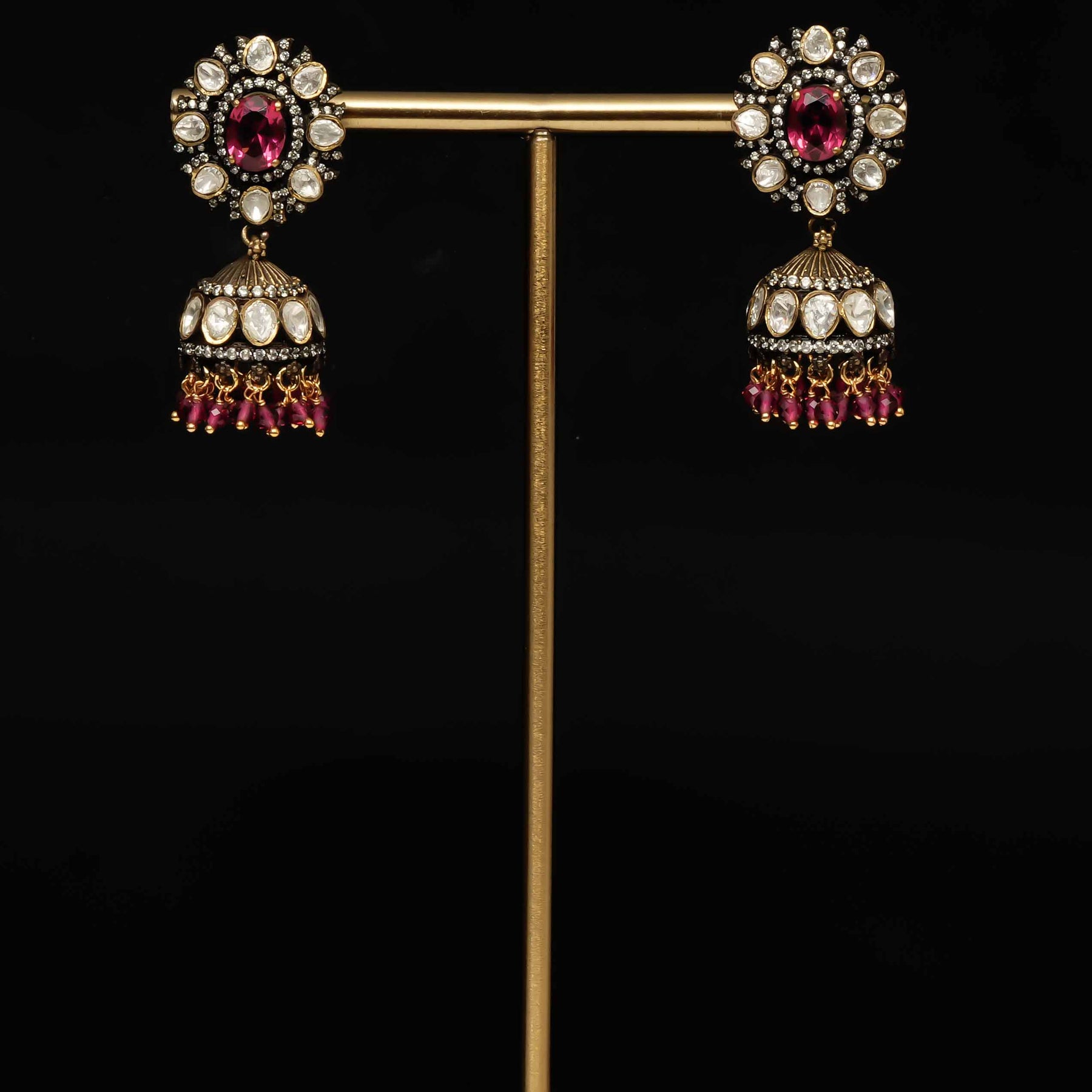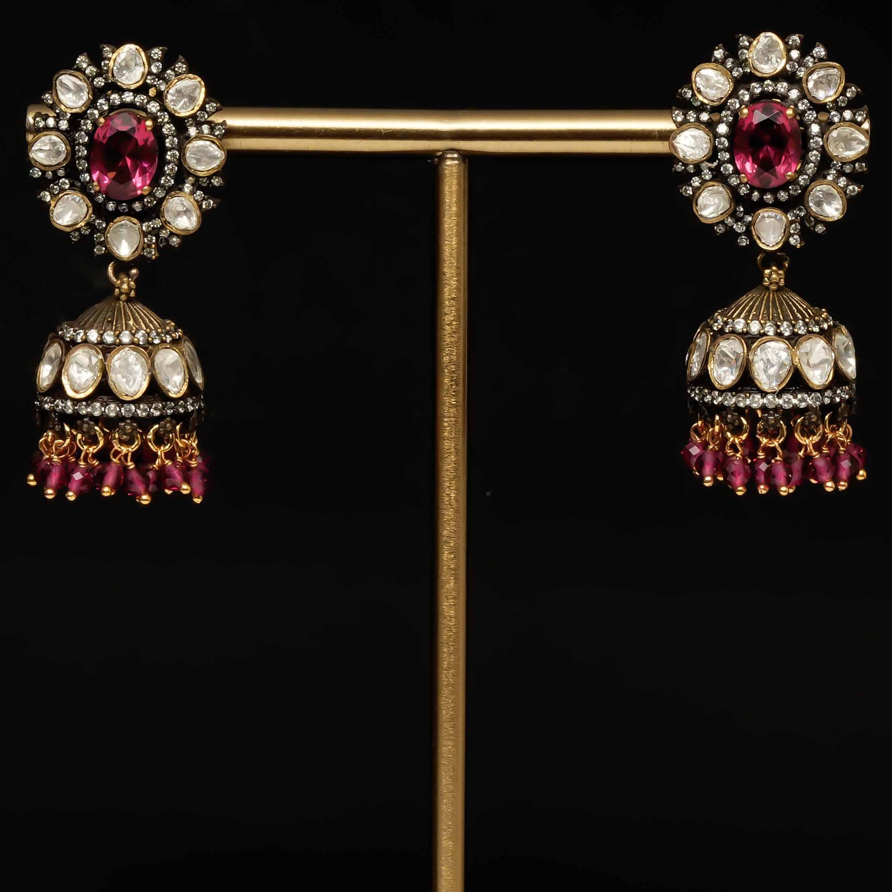 These Victorian Jhumka Earrings showcase exquisite craftsmanship with delicately dangling pearls that enhance their timeless appeal. Handcrafted with precision, they feature moissanite stones that mimic the brilliance of real precious gems, offering a luxurious look without compromise. Their unique, one-of-a-kind design blends classic Victorian elegance with traditional Indian artistry, making them a distinguished addition to any fine jewelry collection. Perfect for those who appreciate expert detailing and enduring style.
