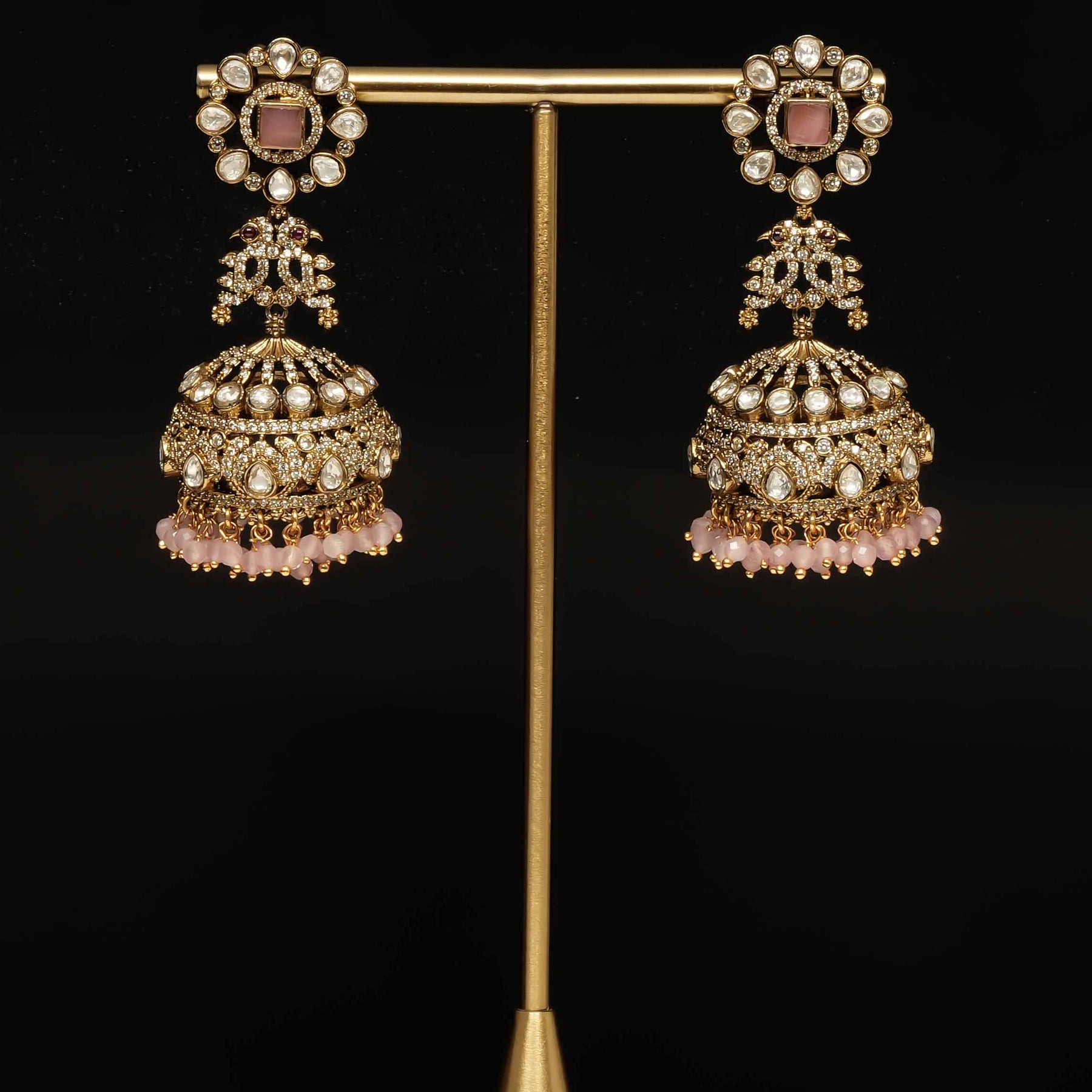These Victorian Jhumka Earrings showcase exquisite craftsmanship, featuring delicate pearls that dangle gracefully. Handcrafted with precision, they mimic the brilliance of real precious stones, offering a unique and timeless design. Perfect for those seeking an elegant statement piece with a one-of-a-kind charm.