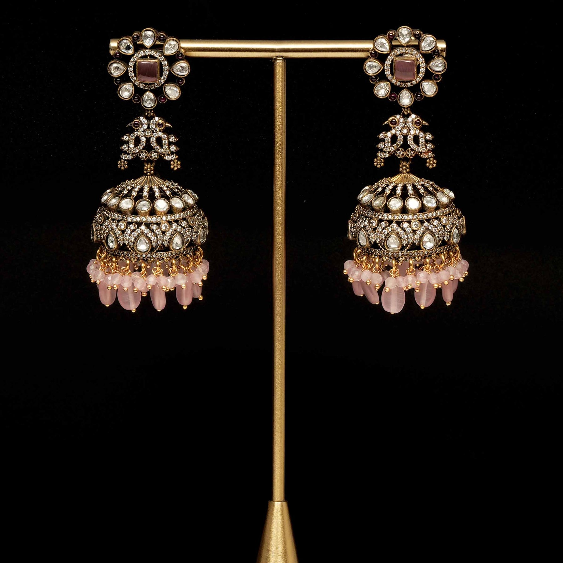 These Victorian Jhumka Earrings showcase exquisite craftsmanship, featuring delicate pearls that dangle gracefully. Handcrafted with precision, they mimic the brilliance of real precious stones, offering a unique and timeless design. Perfect for those seeking an elegant statement piece with a one-of-a-kind charm.