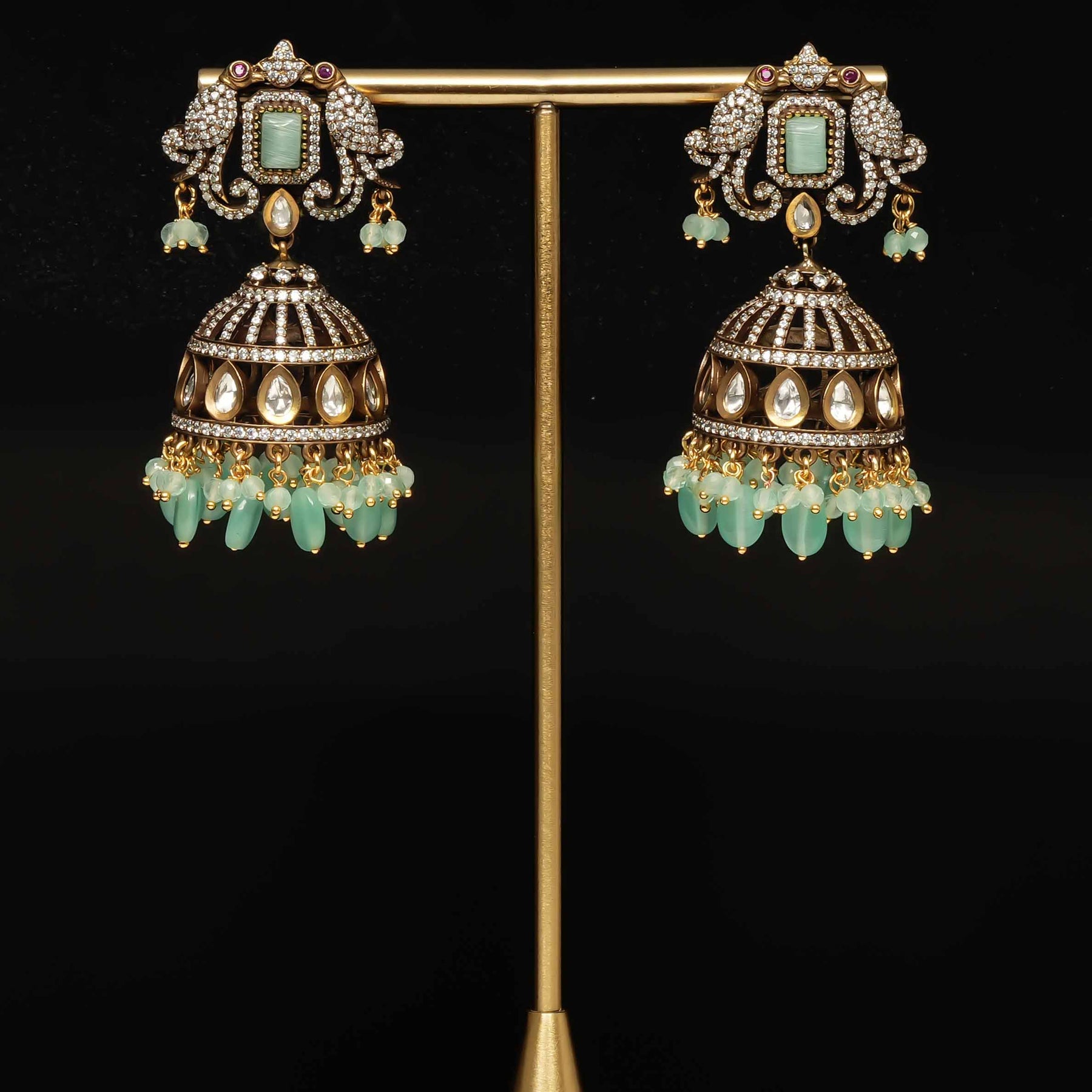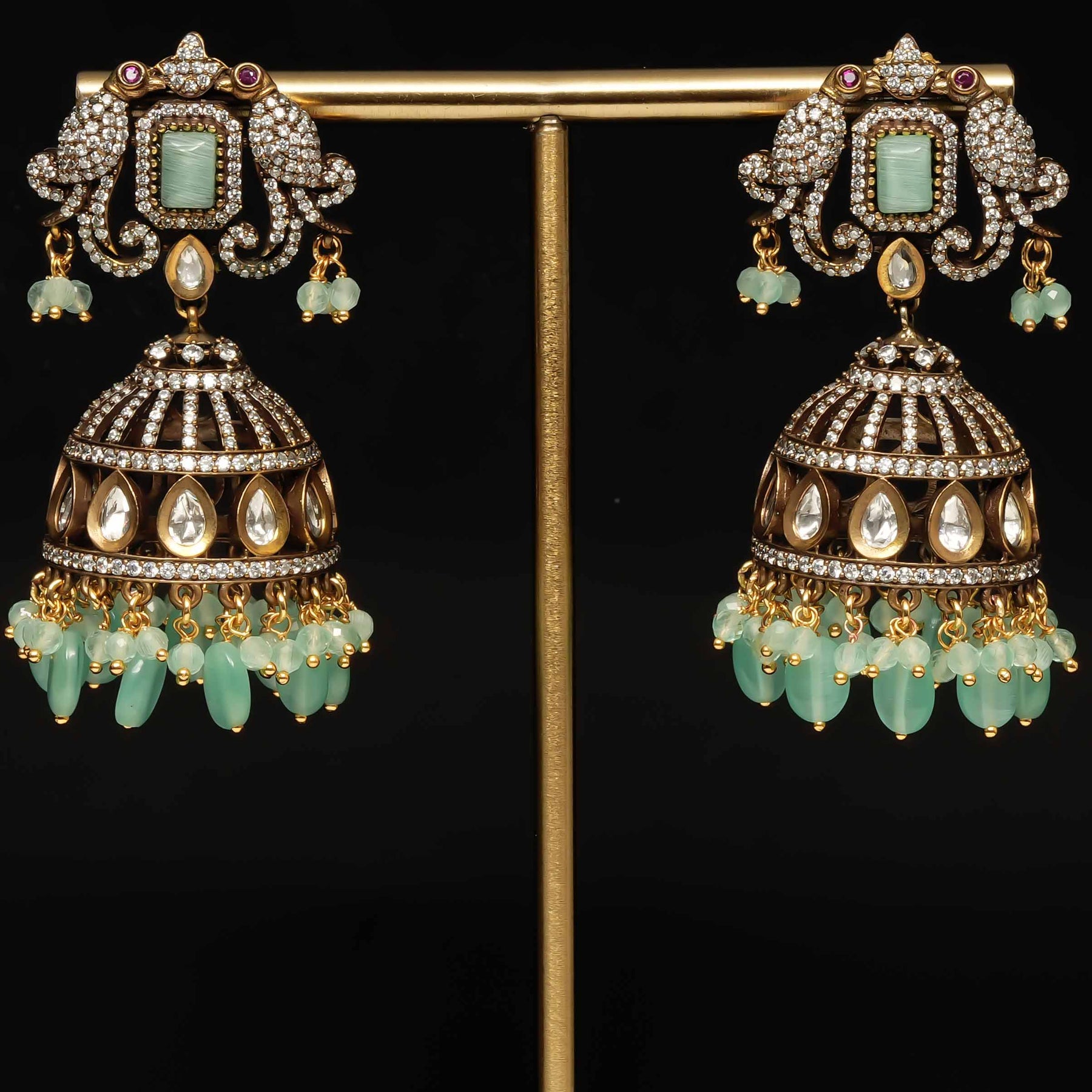 These Victorian Jhumka Earrings showcase exquisite craftsmanship with delicately handcrafted details. Featuring lustrous pearls that dangle gracefully, they capture the elegance of real precious stones. Their unique design blends classic Victorian charm with a one-of-a-kind aesthetic, making them a distinguished addition to any fine jewelry collection. Perfect for those who appreciate timeless beauty and expert artistry.