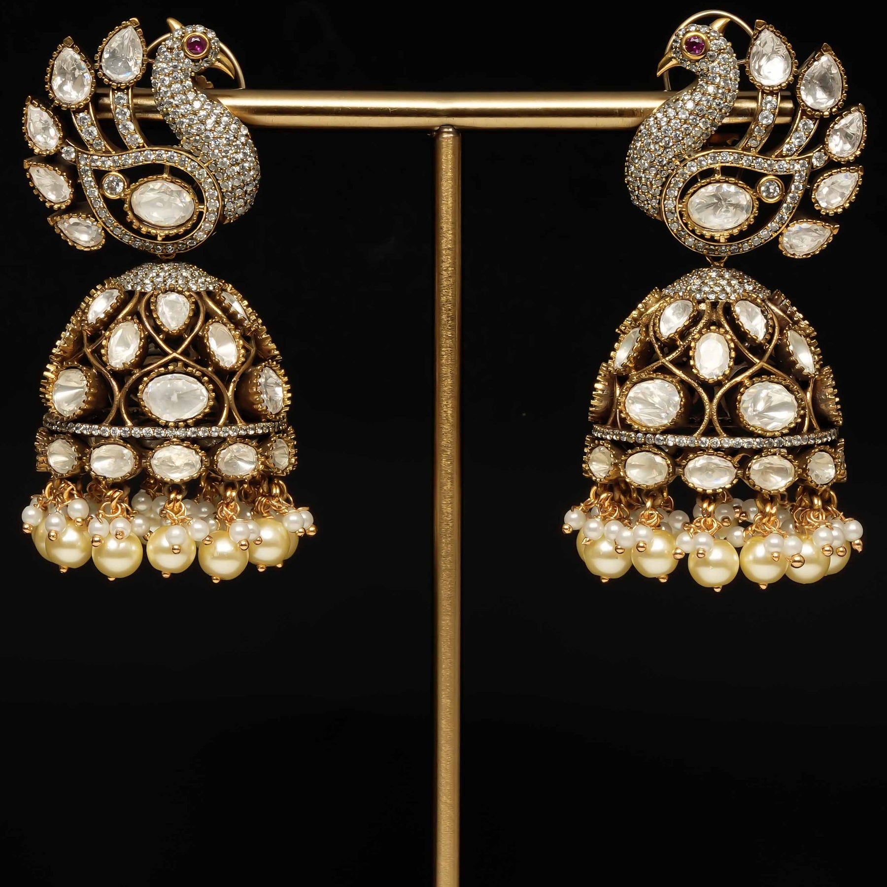 These Victorian Jhumka Earrings showcase exquisite craftsmanship with delicately dangling pearls that enhance their timeless charm. Handcrafted to perfection, they feature moissanite stones that mimic the brilliance of precious gems, offering a luxurious look without compromise. Each pair is a unique design, blending classic elegance with intricate detailing, ideal for those seeking a one-of-a-kind accessory that elevates any ensemble.