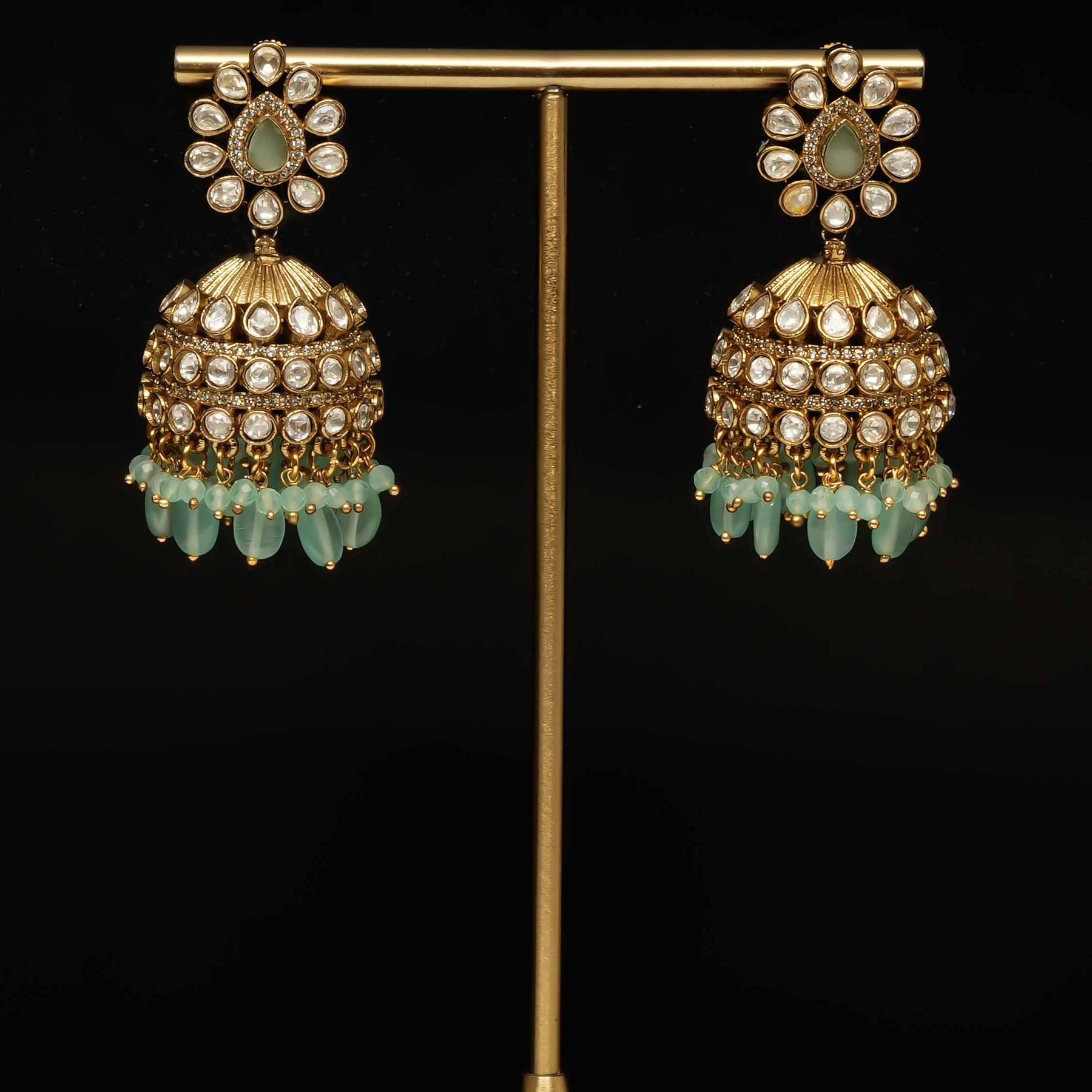These Victorian Jhumka Earrings showcase exquisite craftsmanship with delicately dangling pearls that enhance their timeless appeal. Handcrafted with precision, they feature moissanite stones that mimic the brilliance of real precious gems, offering a unique and elegant design. Perfect for those seeking a one-of-a-kind accessory that blends classic Victorian style with modern sophistication.
