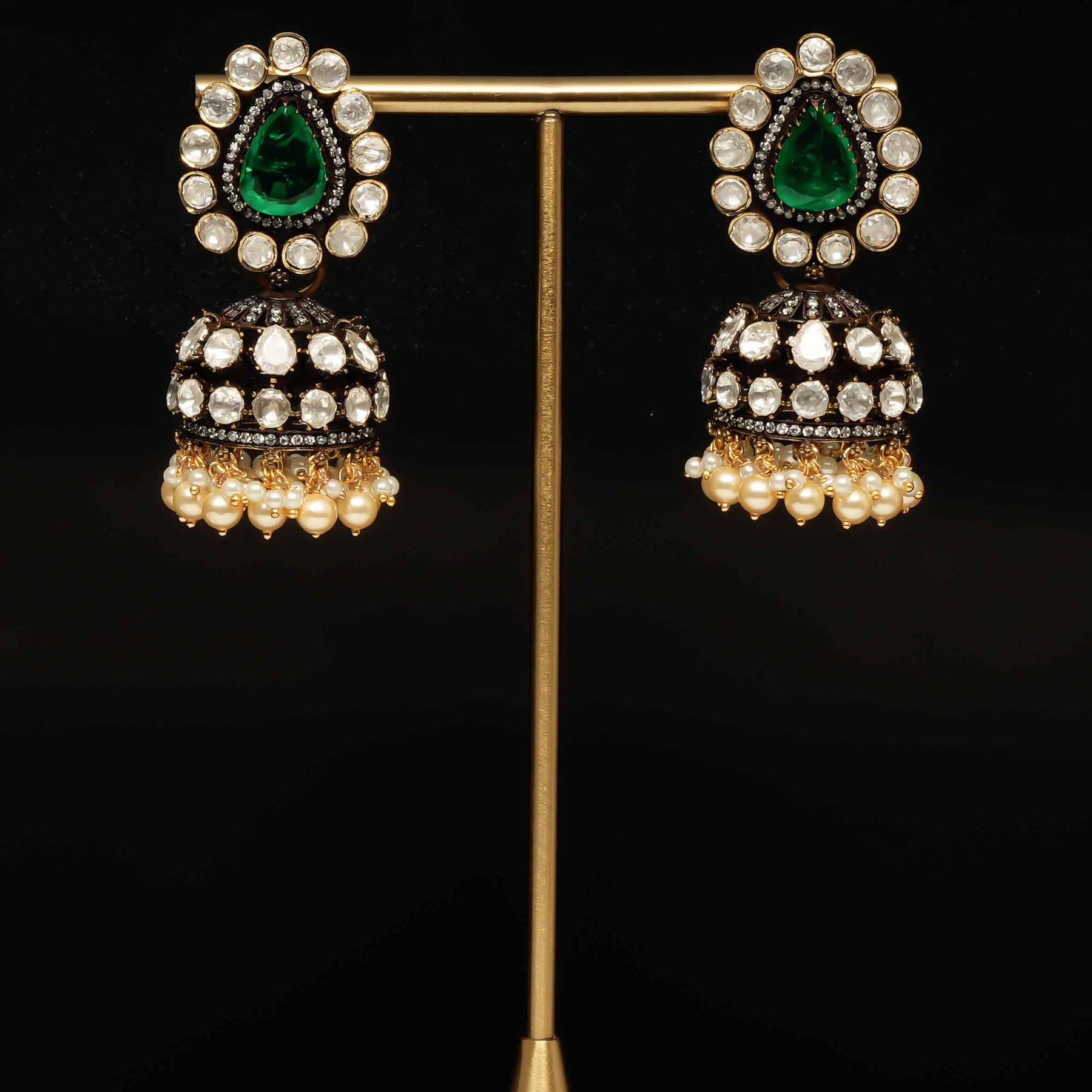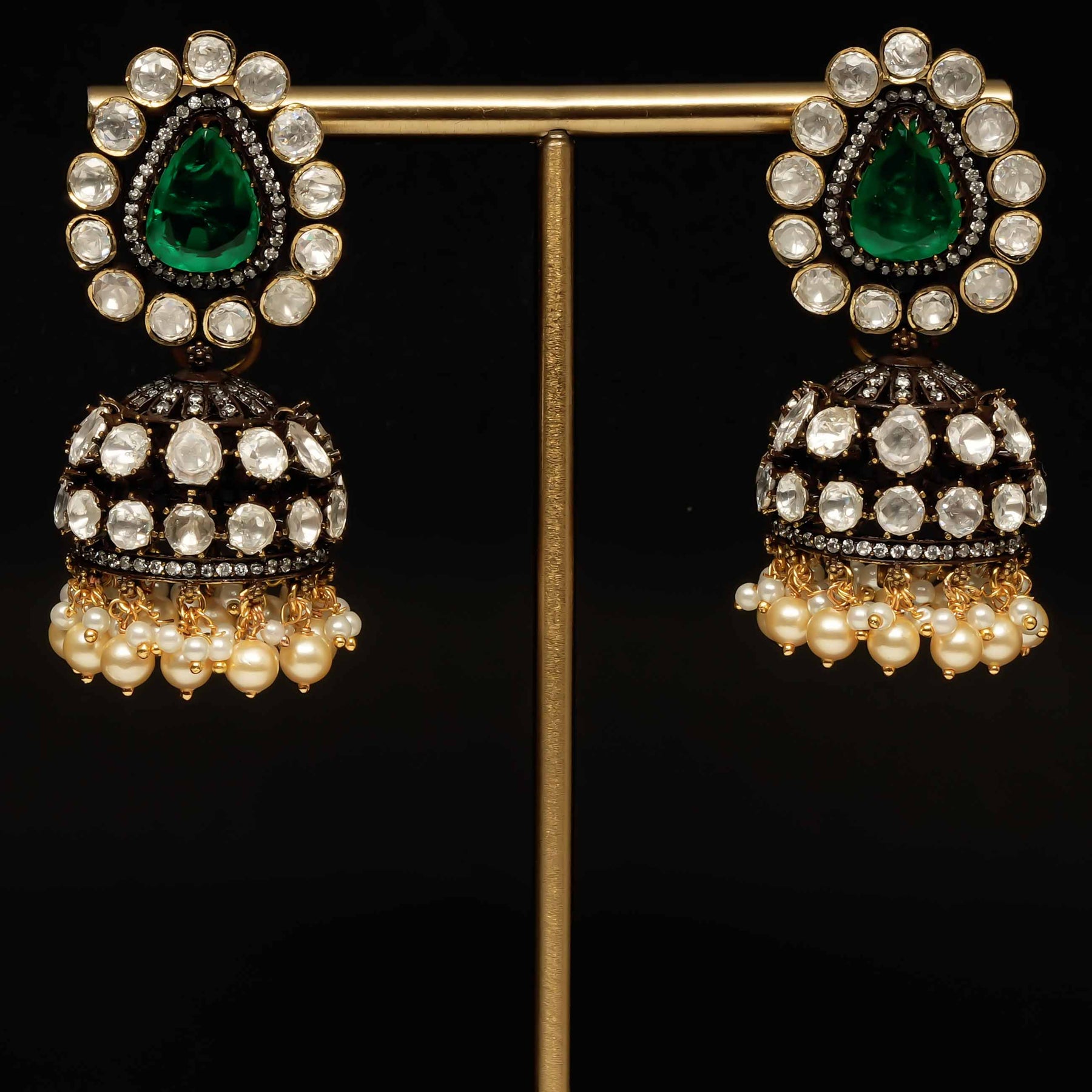 These Victorian Jhumka Earrings showcase exquisite craftsmanship with delicately handcrafted details. Featuring lustrous pearls that dangle gracefully, they capture the timeless elegance of real precious stones. Their unique design blends classic Victorian charm with a modern touch, making each pair truly one of a kind. Perfect for those seeking sophisticated jewelry that stands out with subtle luxury and expert artistry.
