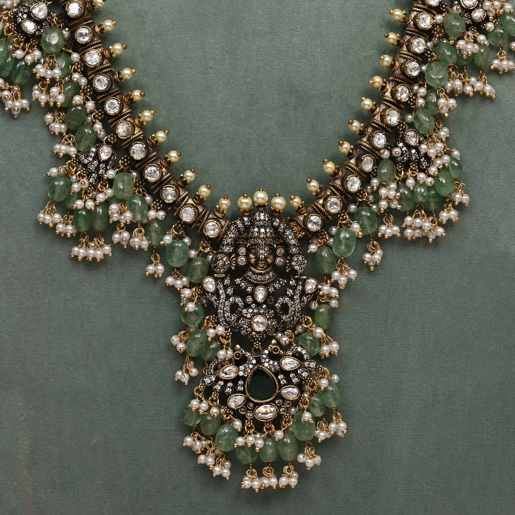 This Victorian necklace set showcases expert craftsmanship with its unique, one-of-a-kind design. Featuring real CZ and moissanite stones, it offers the brilliance and sparkle of genuine diamonds. Delicately accented with dangling pearls, this handcrafted piece combines timeless elegance with exceptional quality, making it a standout addition to any fine jewelry collection.