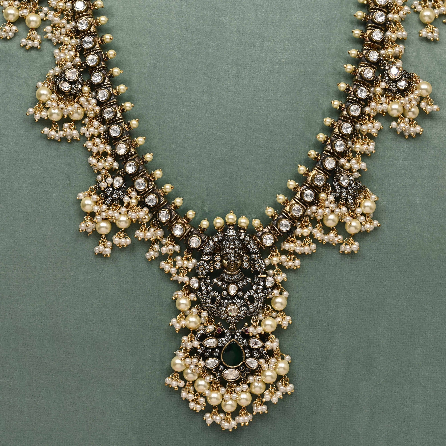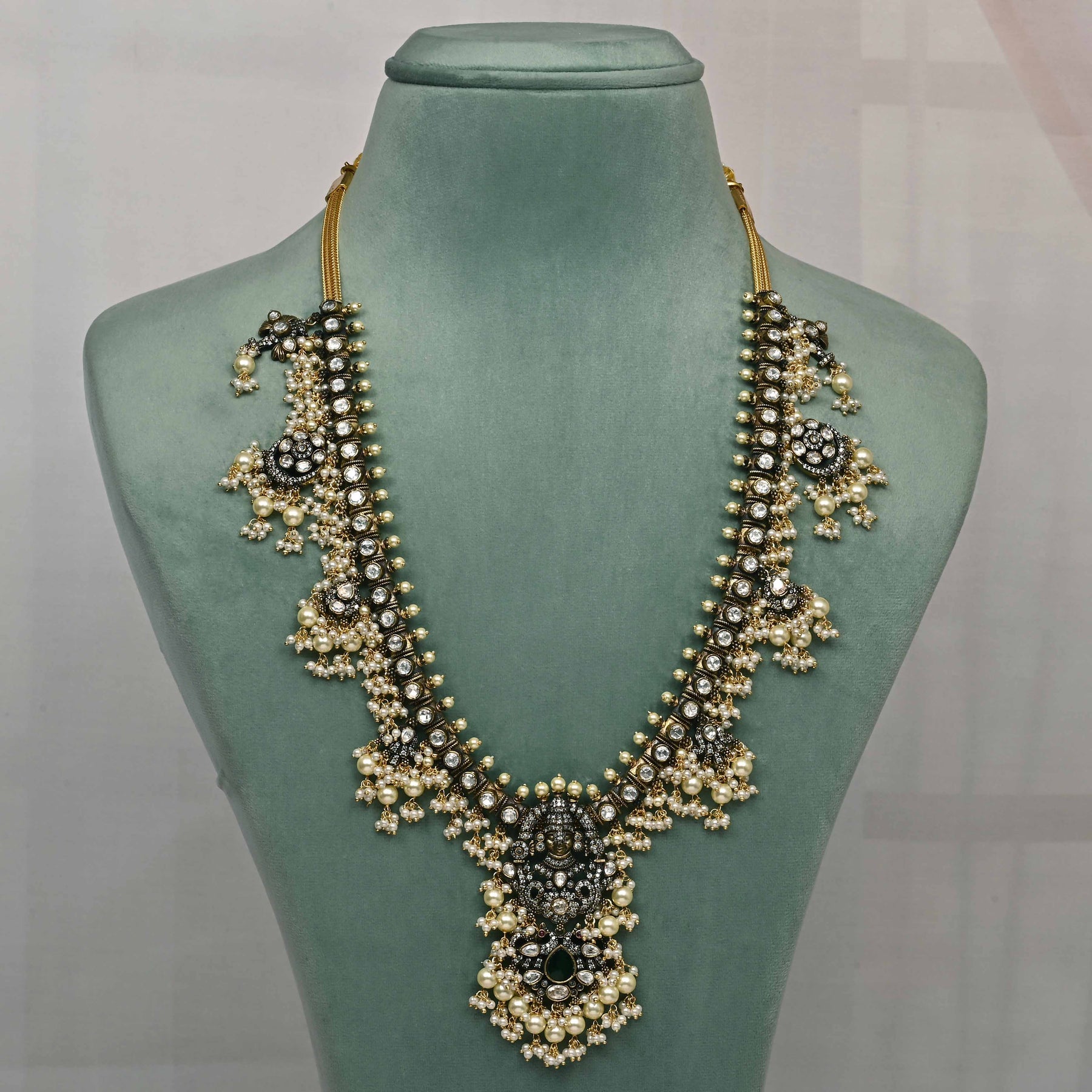 This Victorian Necklace Set showcases exquisite craftsmanship with a unique, one-of-a-kind design. Featuring real cubic zirconia and moissanite stones, it offers the brilliance and sparkle of genuine diamonds. Delicately accented with dangling pearls, this handcrafted piece combines timeless elegance with expert artistry, making it a standout addition to any fine jewelry collection.