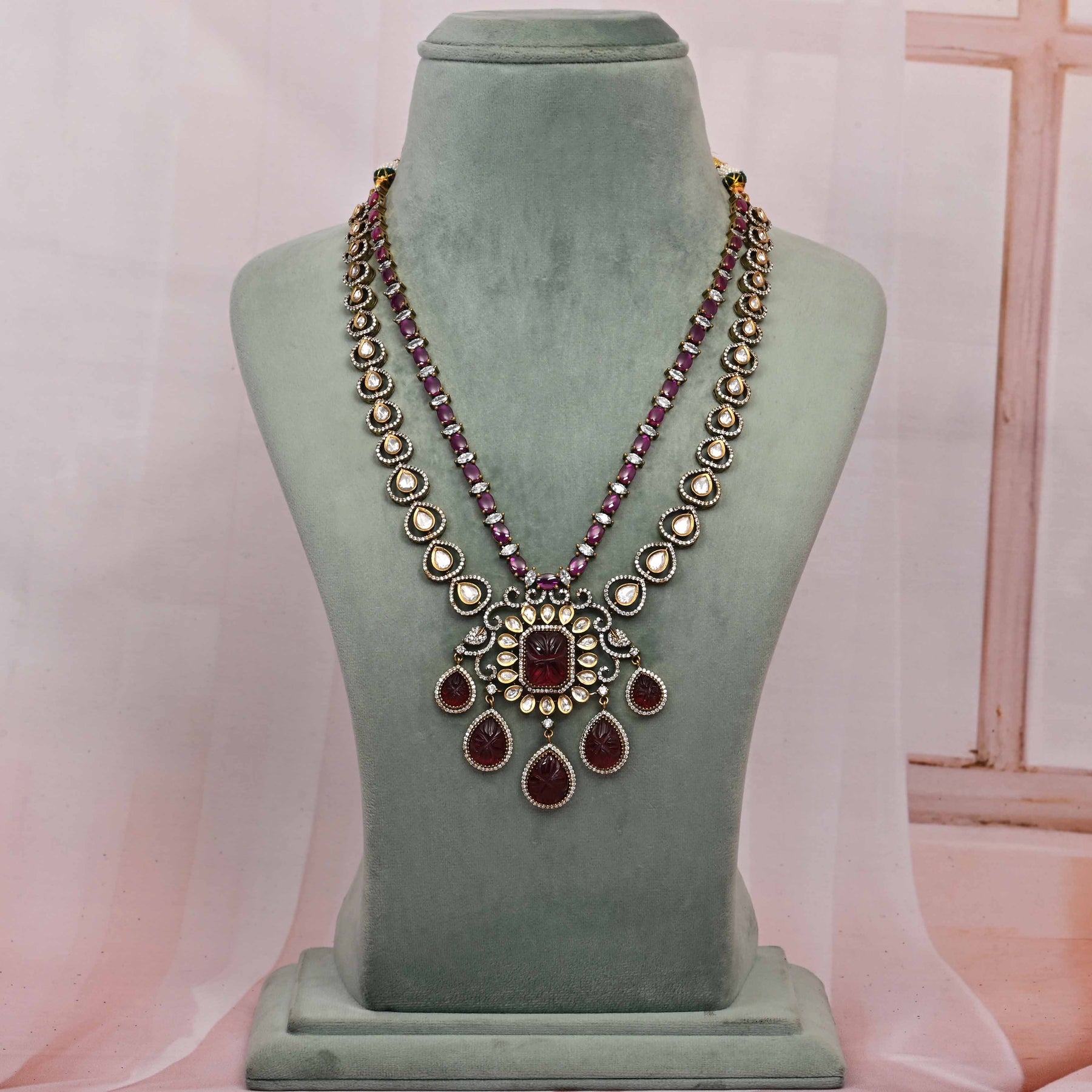 This Victorian Necklace Set showcases expert craftsmanship with a unique, one-of-a-kind design. Featuring real CZ and moissanite stones, it offers the brilliance and sparkle of genuine diamonds. Delicately accented with dangling pearls, this handcrafted piece combines timeless elegance with exceptional detail, making it a distinguished addition to any fine jewellery collection.