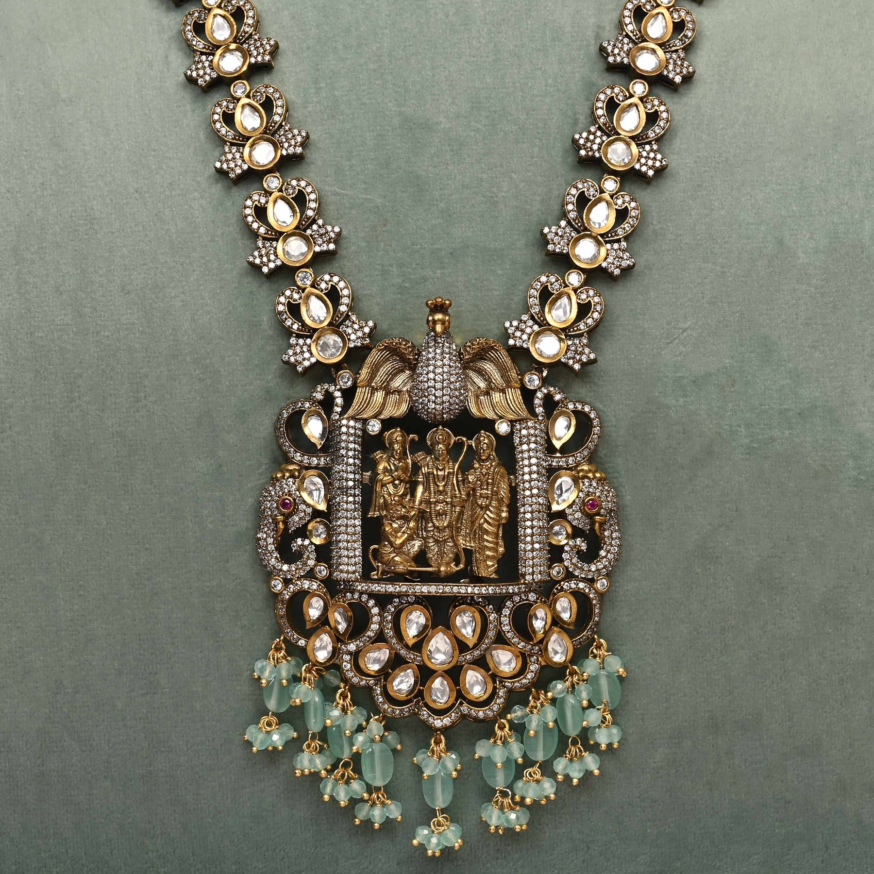 This Victorian necklace set showcases expert craftsmanship with its unique, one-of-a-kind design. Featuring real CZ and moissanite stones, it offers the brilliance and sparkle of genuine diamonds. Delicately accented with dangling pearls, this handcrafted piece combines timeless elegance with exceptional quality, making it a distinguished addition to any fine jewelry collection.