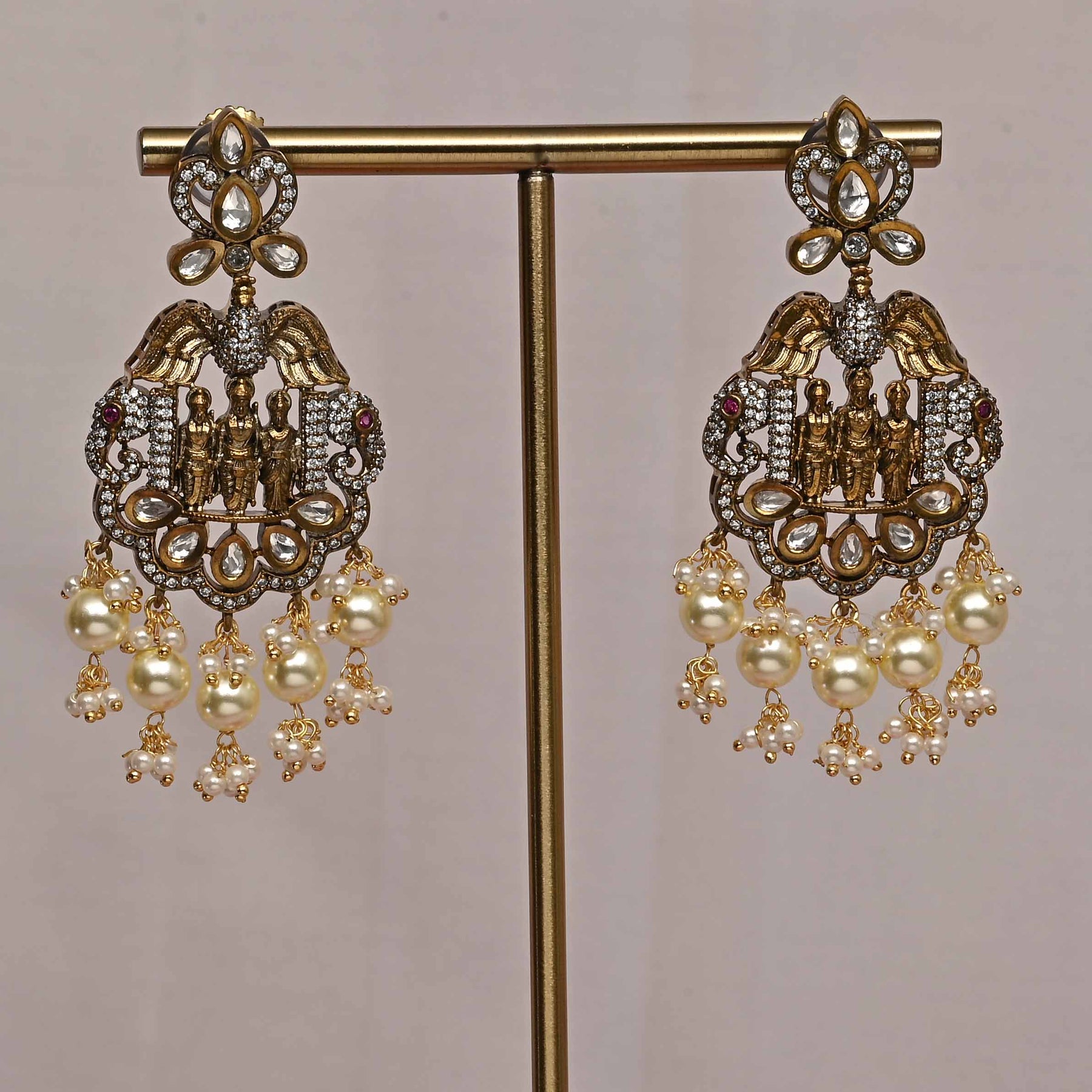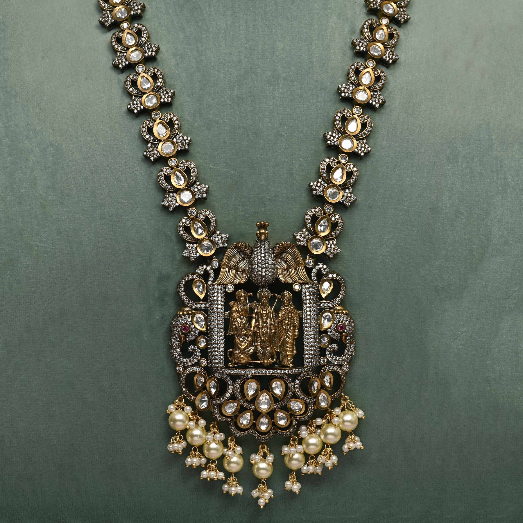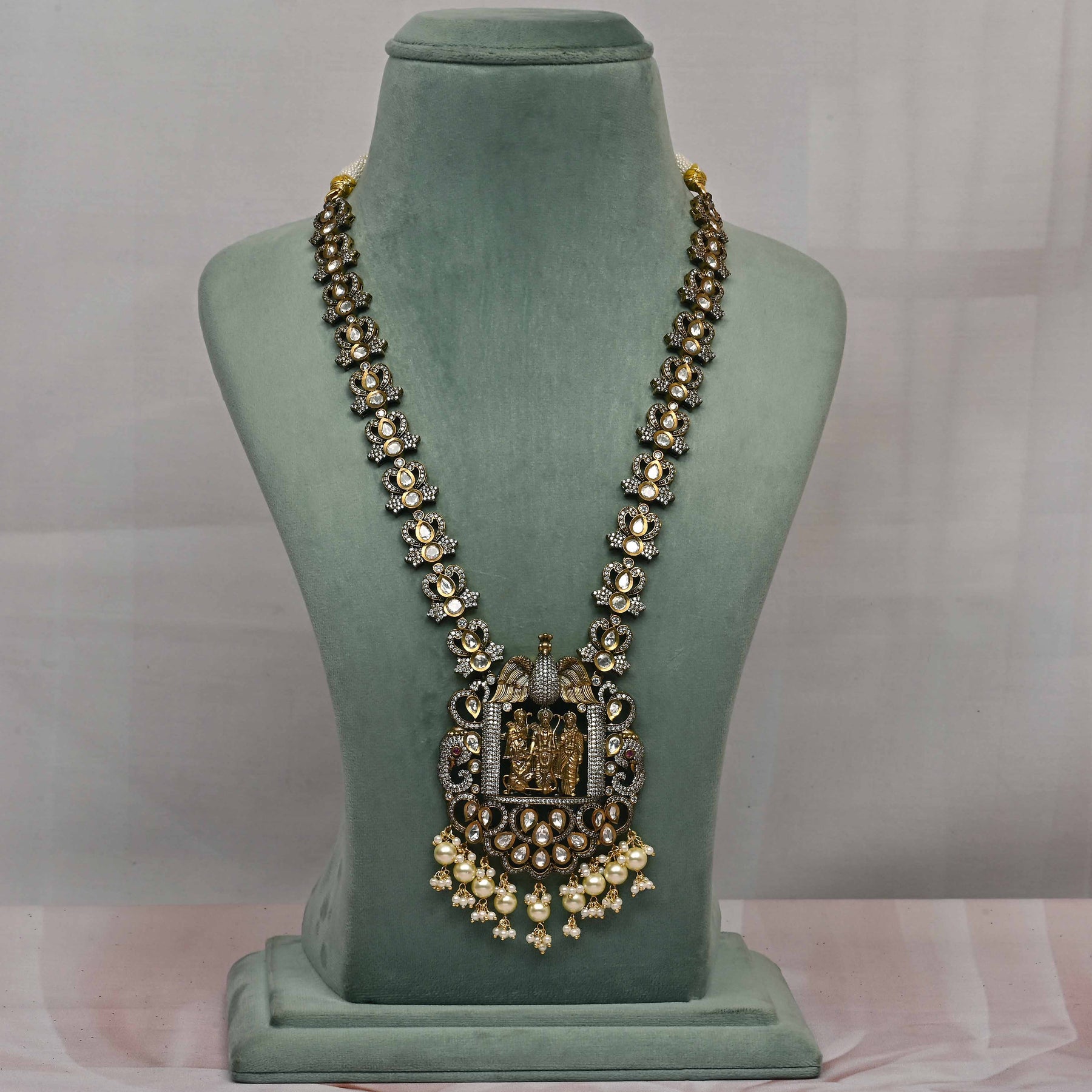 This Victorian necklace set showcases exquisite craftsmanship with a unique, one-of-a-kind design. Featuring real CZ and moissanite stones, it offers the brilliance and sparkle of genuine diamonds. Delicately accented with dangling pearls, this handcrafted piece combines timeless elegance with expert artistry, making it a stunning addition to any fine jewelry collection.
