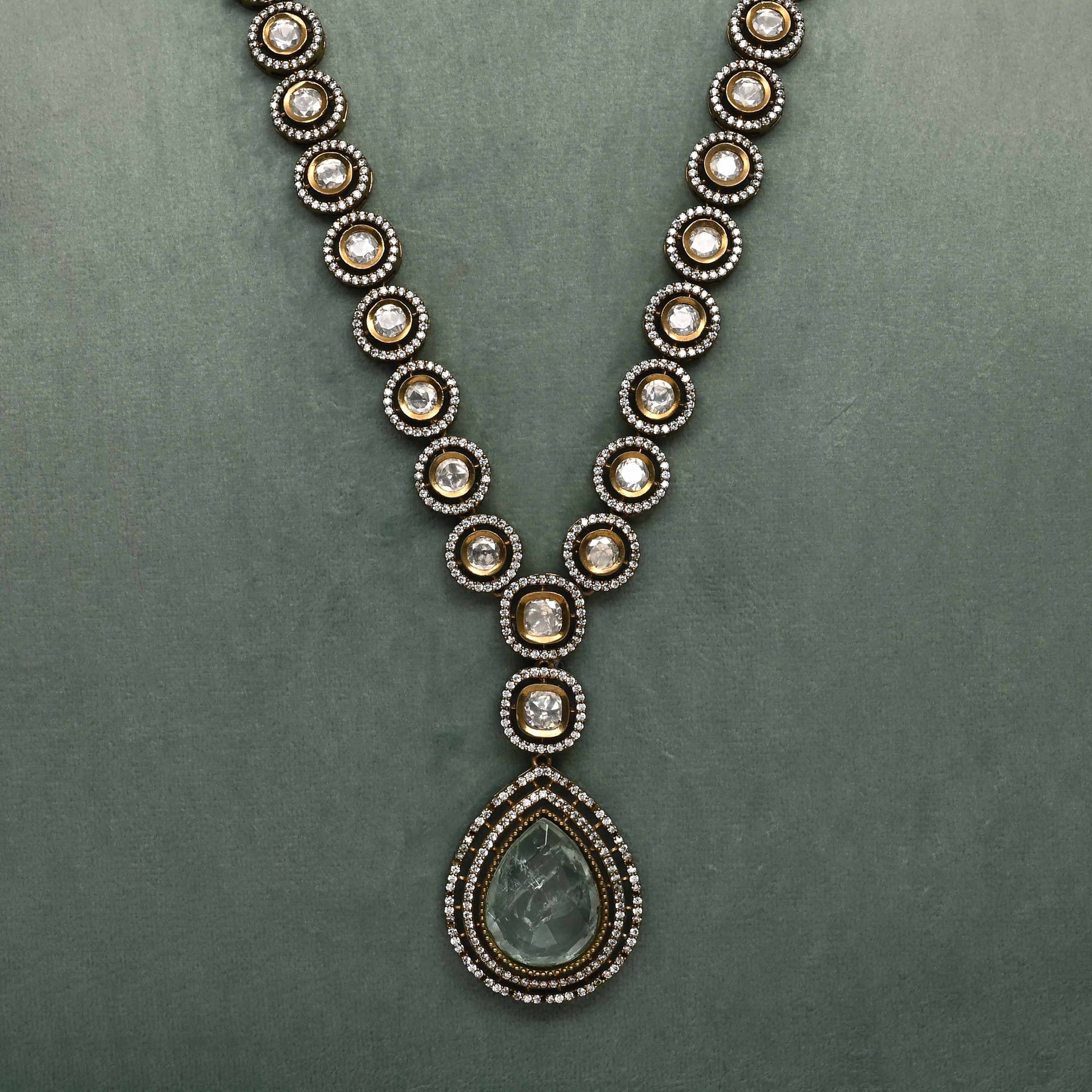 This Victorian necklace set showcases expert craftsmanship with a unique, one-of-a-kind design. Featuring real CZ and moissanite stones, it offers the brilliance and sparkle of genuine diamonds. Delicately accented with dangling pearls, this handcrafted piece combines timeless elegance with exceptional quality, making it a stunning addition to any fine jewelry collection.