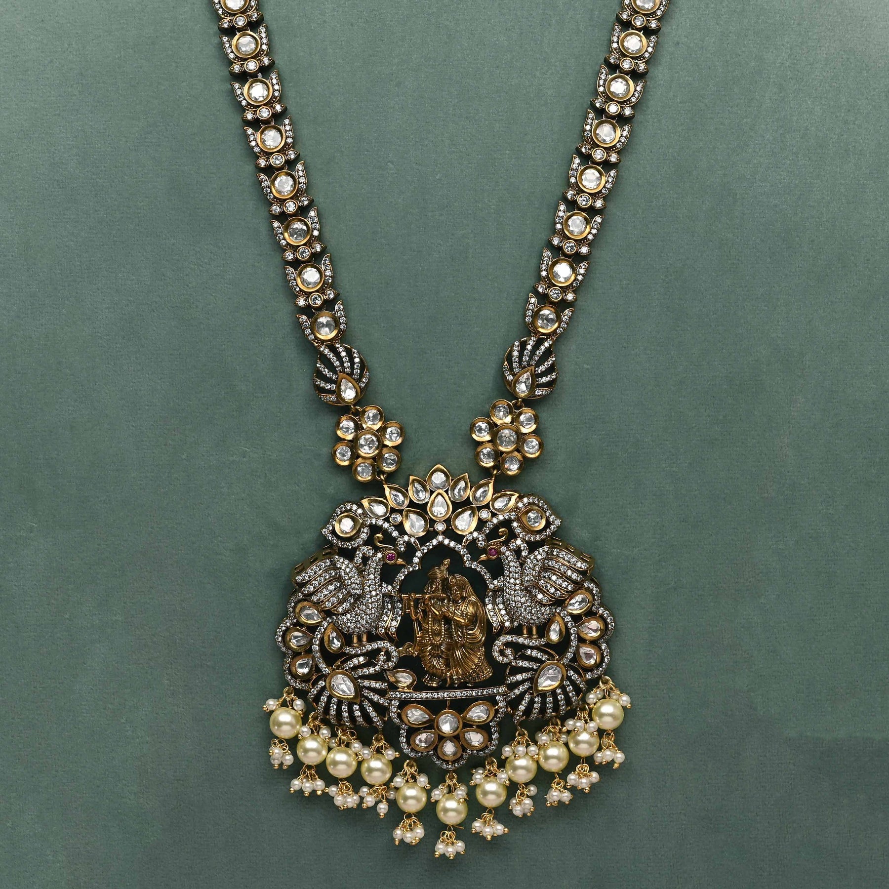 This Victorian necklace set showcases expert craftsmanship with a unique, one-of-a-kind design. Featuring real CZ and moissanite stones, it offers the brilliance and sparkle of genuine diamonds. Delicately accented with dangling pearls, this handcrafted piece combines timeless elegance with exceptional quality, perfect for those seeking a sophisticated and authentic vintage-inspired accessory.