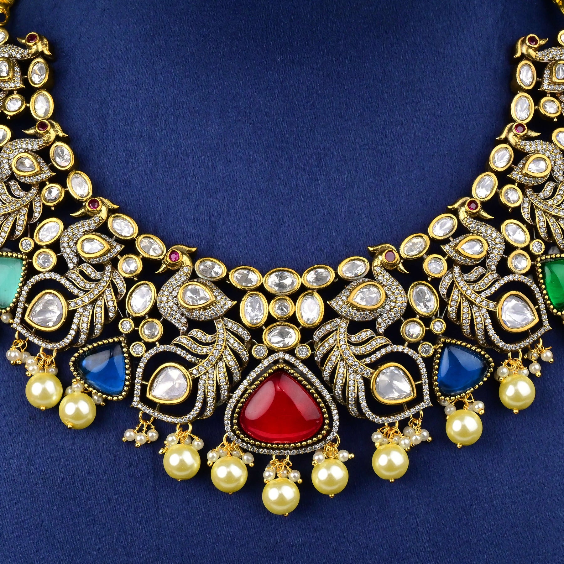 This Victorian Navarathna Necklace Set is a masterful blend of tradition and luxury, handcrafted to perfection with a unique, one-of-a-kind design. It features real CZ and moissanite stones that emulate the brilliance of genuine diamonds, complemented by elegant dangling pearls. The Navarathna arrangement adds cultural significance, making this necklace set a distinguished piece that combines expert craftsmanship with timeless beauty.