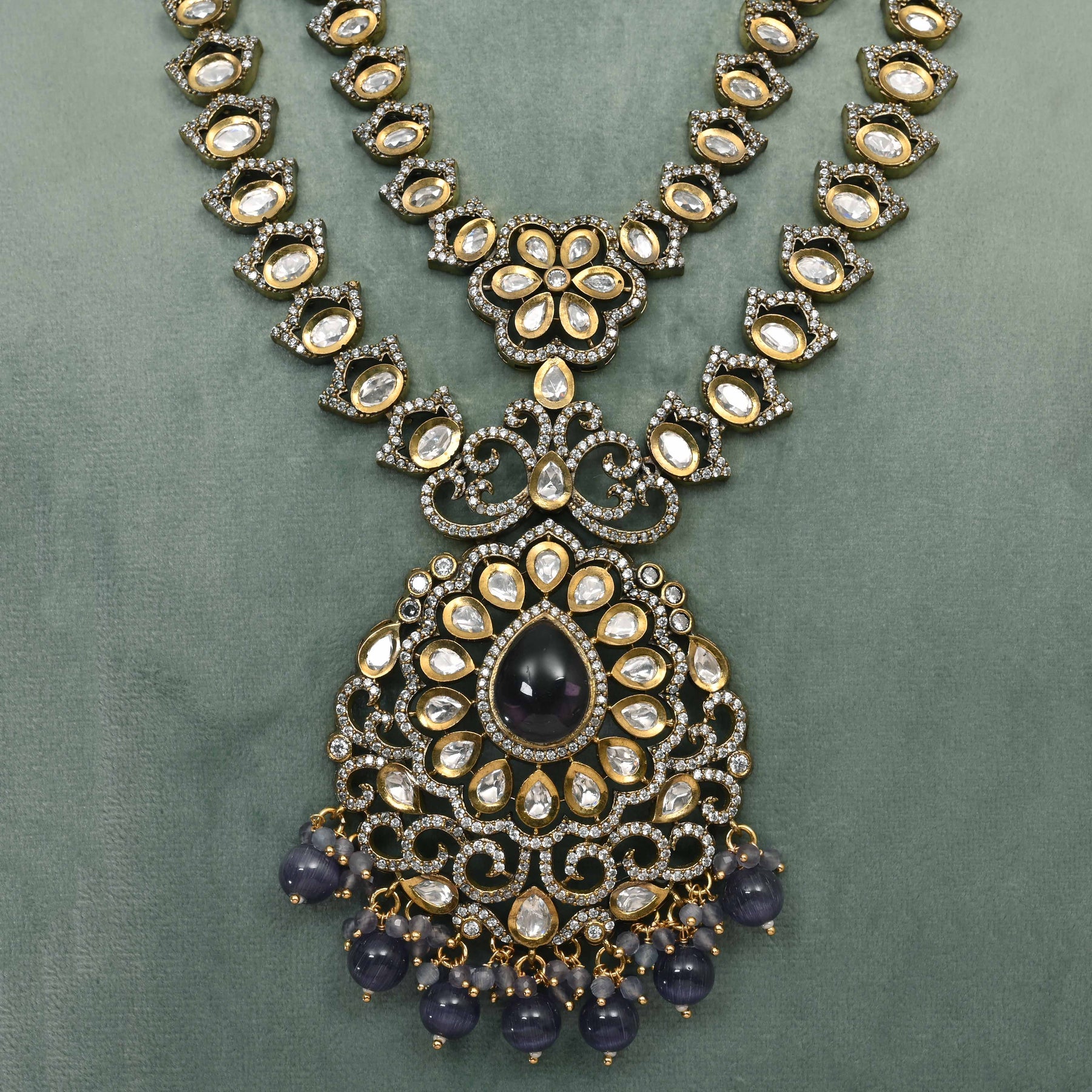 This Victorian Necklace Set showcases expert craftsmanship with a unique, one-of-a-kind design. Featuring real CZ and moissanite stones, it offers the brilliance and sparkle of genuine diamonds. Delicately accented with dangling pearls, this handcrafted piece combines timeless elegance with exceptional detail, making it a distinguished addition to any fine jewelry collection.