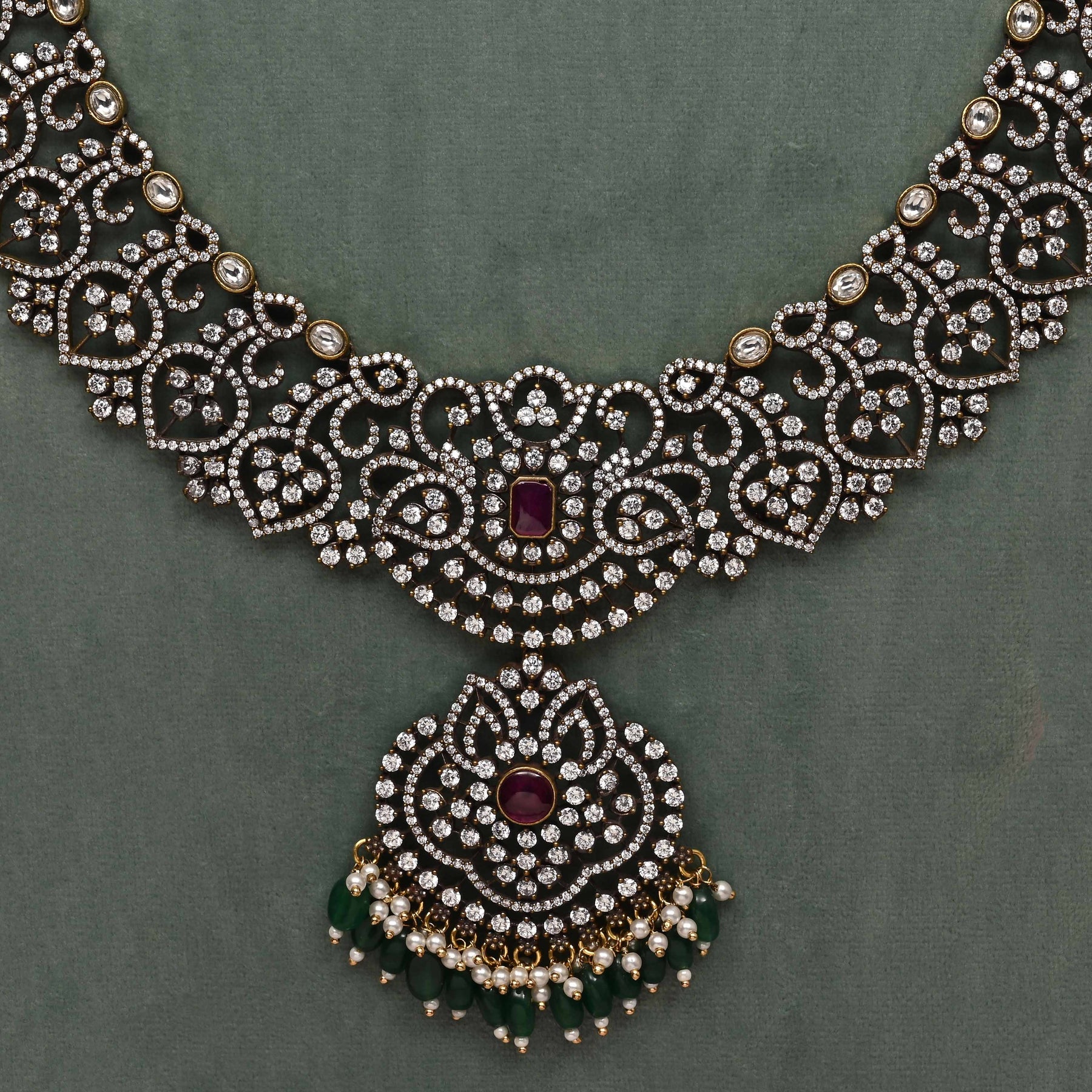 This Victorian necklace set showcases expert craftsmanship with a unique, one-of-a-kind design. Featuring real CZ and moissanite stones, it offers the brilliance and sparkle of genuine diamonds. Delicately accented with dangling pearls, this handcrafted piece combines timeless elegance with exceptional quality, making it a distinguished addition to any fine jewelry collection.