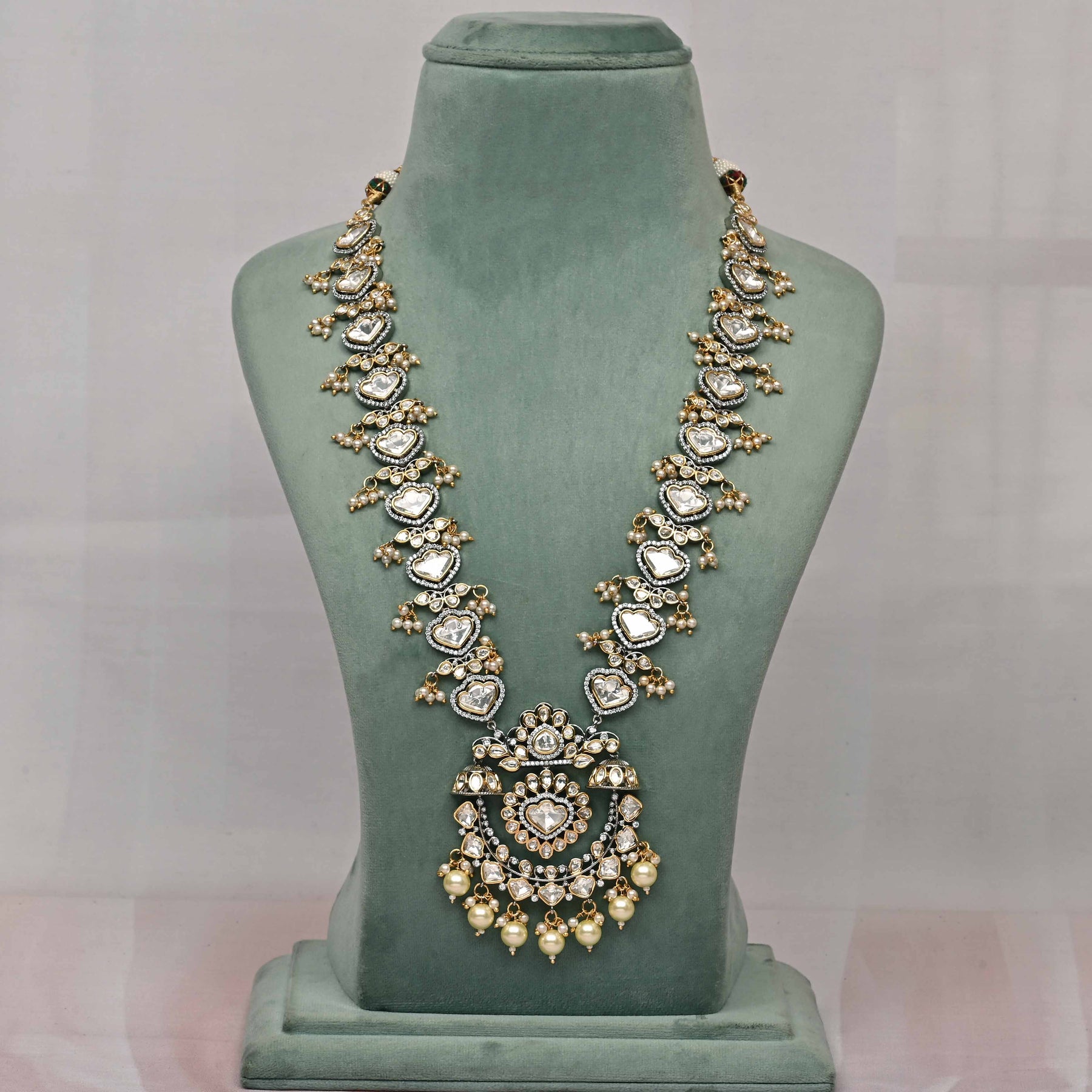 This Victorian necklace set showcases expert craftsmanship with its unique, one-of-a-kind design. Featuring real cubic zirconia and moissanite stones, it offers the brilliance and sparkle of genuine diamonds. Delicately accented with dangling pearls, this handcrafted piece combines timeless elegance with exceptional detail, making it a distinguished addition to any fine jewelry collection.