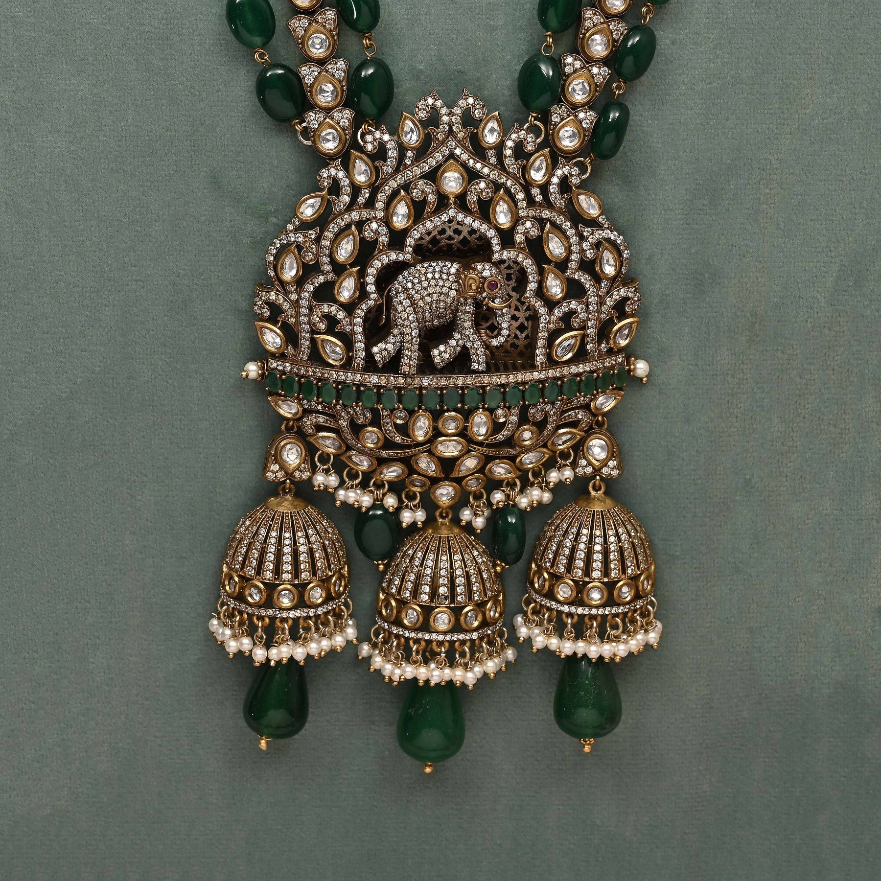 This Victorian necklace set showcases expert craftsmanship with a unique, one-of-a-kind design. Featuring real cubic zirconia and moissanite stones, it offers the brilliance and sparkle of genuine diamonds. Delicately accented with dangling pearls, this handcrafted piece combines timeless elegance with exceptional detail, making it a distinguished addition to any fine jewelry collection.