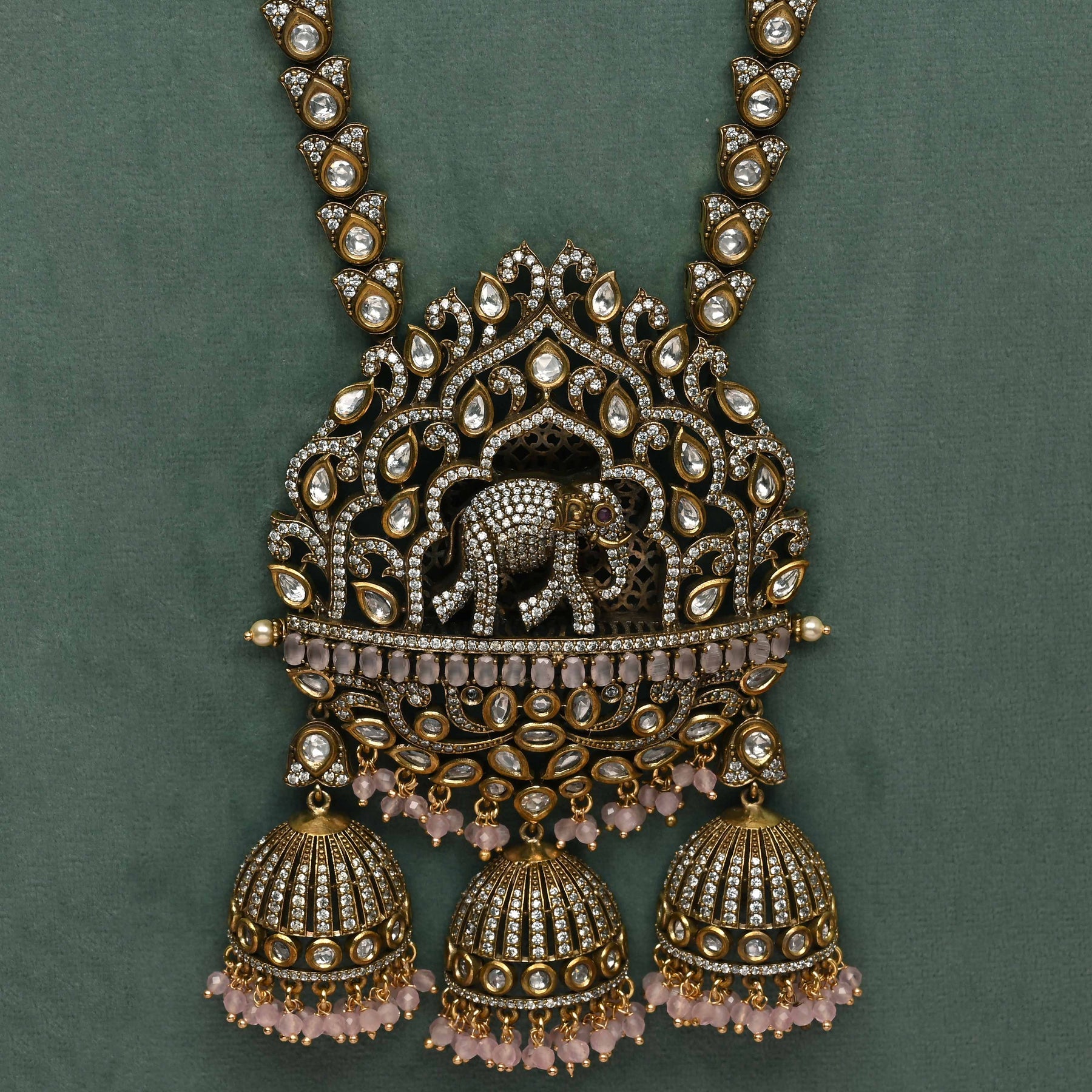 This Victorian necklace set showcases expert craftsmanship with a unique, one-of-a-kind design. Featuring real CZ and moissanite stones, it offers the brilliance and sparkle of genuine diamonds. Delicately accented with dangling pearls, this handcrafted piece combines timeless elegance with exceptional quality, making it a standout addition to any fine jewelry collection.