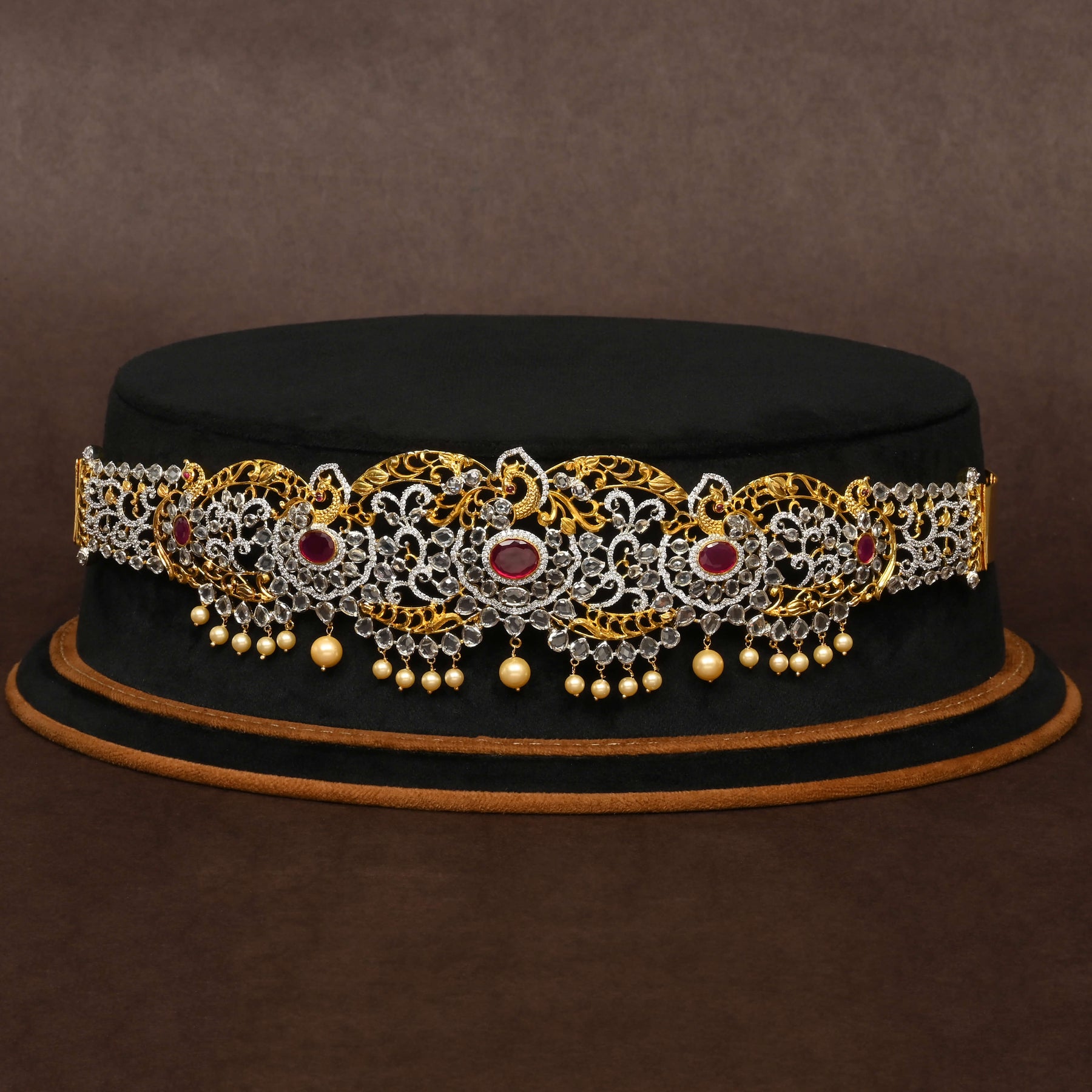 This Victorian-style Vaddanam showcases exquisite craftsmanship, featuring semi-precious emerald and ruby stones alongside uncut polki stones. Accented with real cubic zirconia, this handcrafted piece boasts a unique design that blends tradition with elegance, making it a distinctive heirloom for any collection.