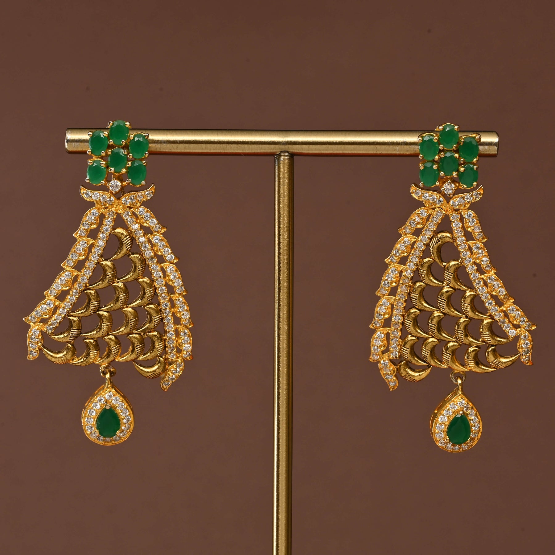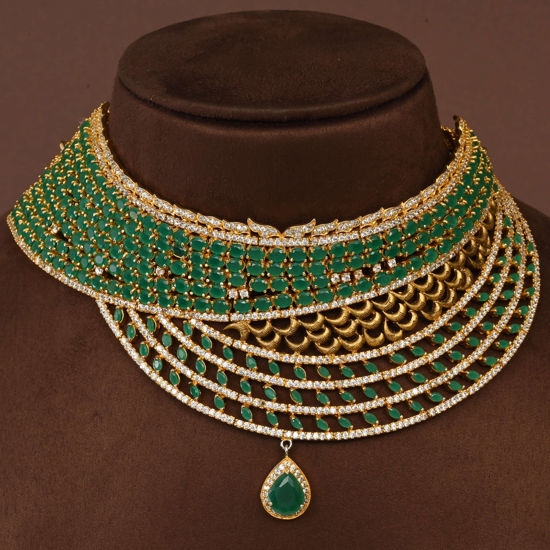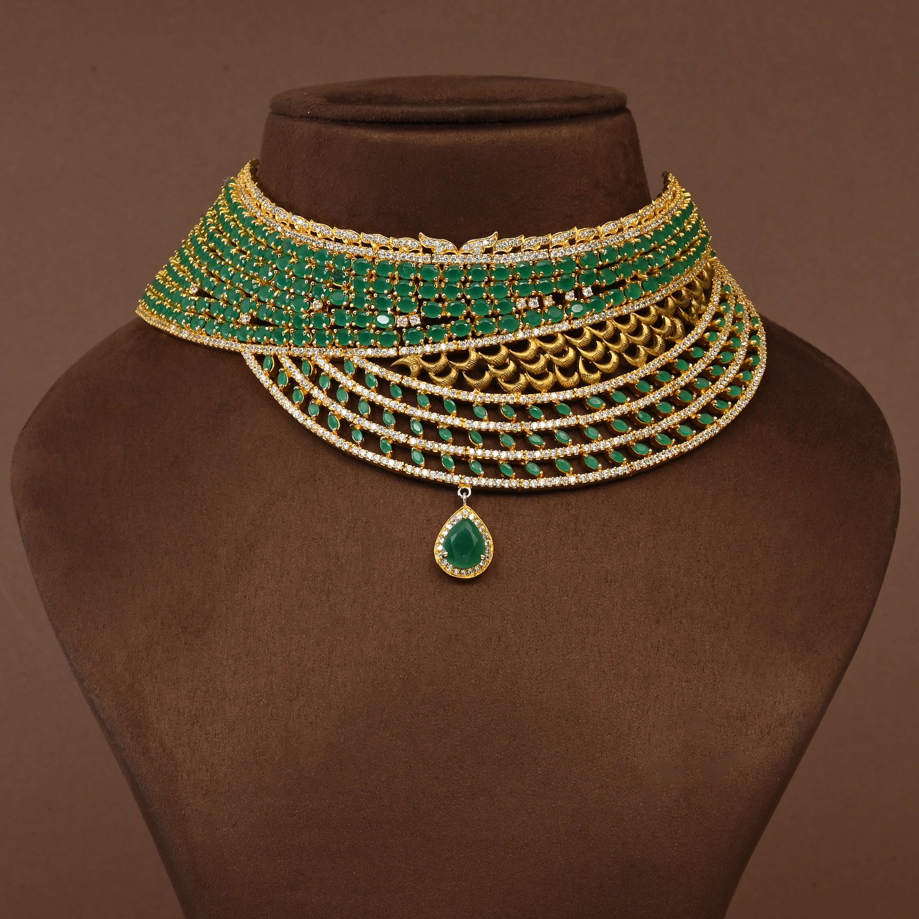 Elevate your jewellery collection with this exquisite CZ Choker Set, meticulously handcrafted in lustrous gold finish. Adorned with semi-precious emerald stones, each piece showcases a distinctive one-of-a-kind design that exudes timeless elegance. The sophisticated choker silhouette offers a refined, classy aesthetic perfect for both special occasions and elevated everyday wear. Crafted with precision and attention to detail, this artisanal set combines contemporary design sensibilities with traditional jewellery-making expertise, making it a treasured addition to any discerning jewellery wardrobe.