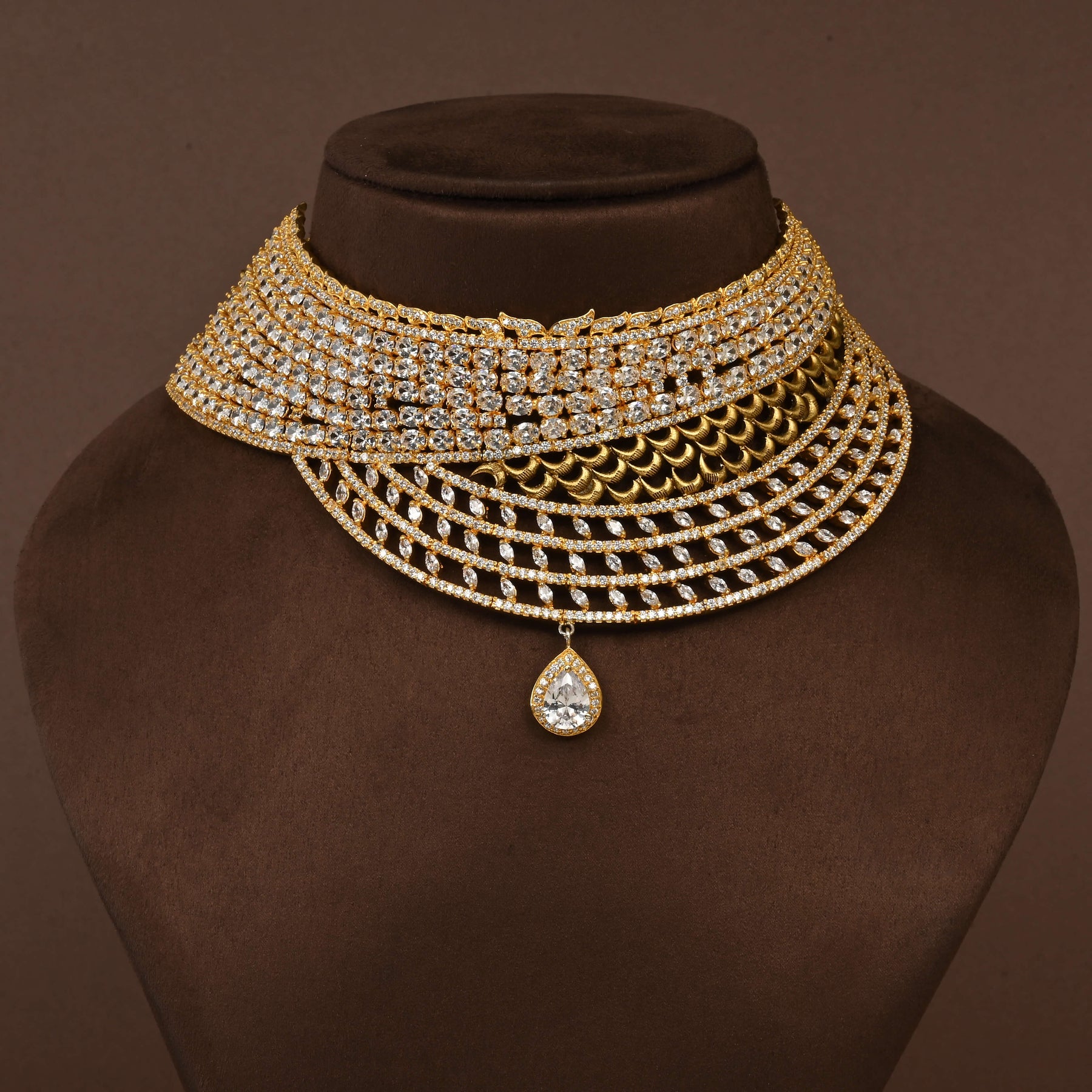 Elevate your jewellery collection with this exquisite CZ Choker Set, meticulously handcrafted in lustrous gold finish. Featuring authentic cubic zirconia stones that capture light with brilliant sparkle, this piece combines timeless elegance with contemporary flair. Each set showcases a distinctive one-of-a-kind design that sets it apart from conventional jewellery, making it an ideal choice for special occasions or everyday sophistication. The expert craftsmanship ensures durability and refined aesthetics, delivering a statement accessory that complements both traditional and modern ensembles with effortless grace.