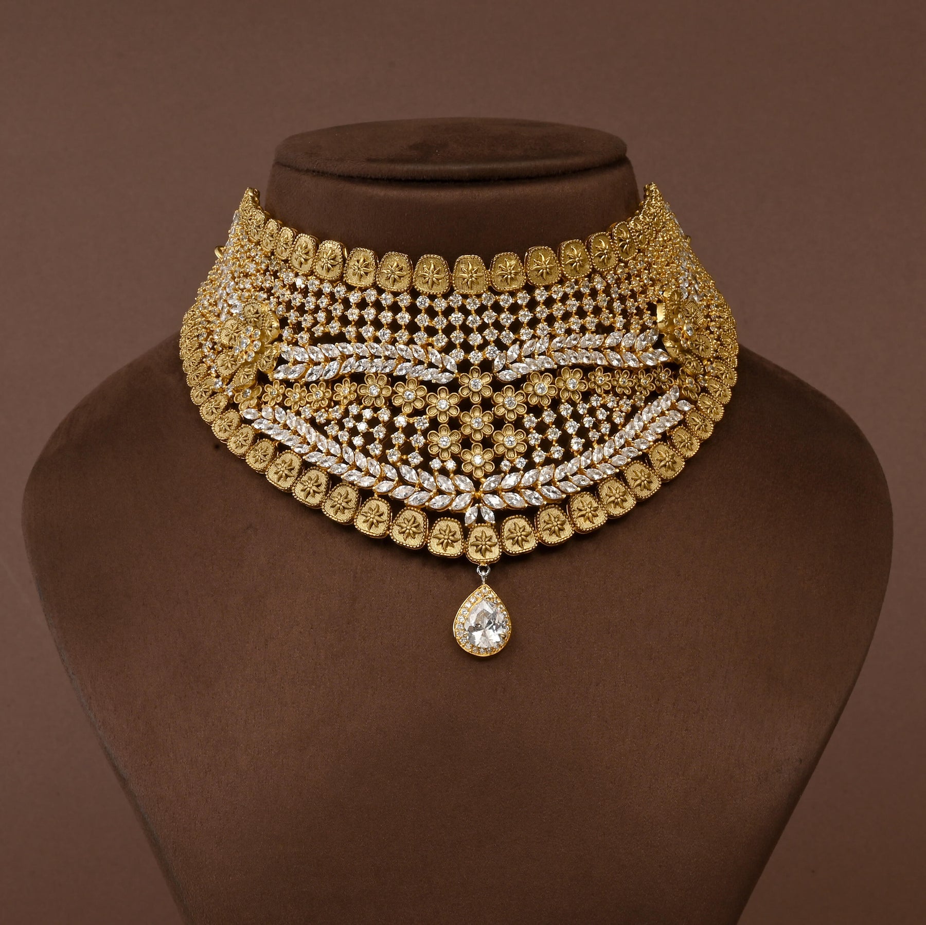 Elevate your jewellery collection with this exquisite CZ Choker Set, meticulously handcrafted in lustrous gold finish. Featuring authentic cubic zirconia stones that sparkle with brilliance, this one-of-a-kind design combines timeless elegance with contemporary flair. Each piece is individually crafted to ensure exceptional quality and distinctive character. Perfect for special occasions or adding a touch of sophistication to your everyday ensemble, this classy choker set makes a striking statement while maintaining refined grace.